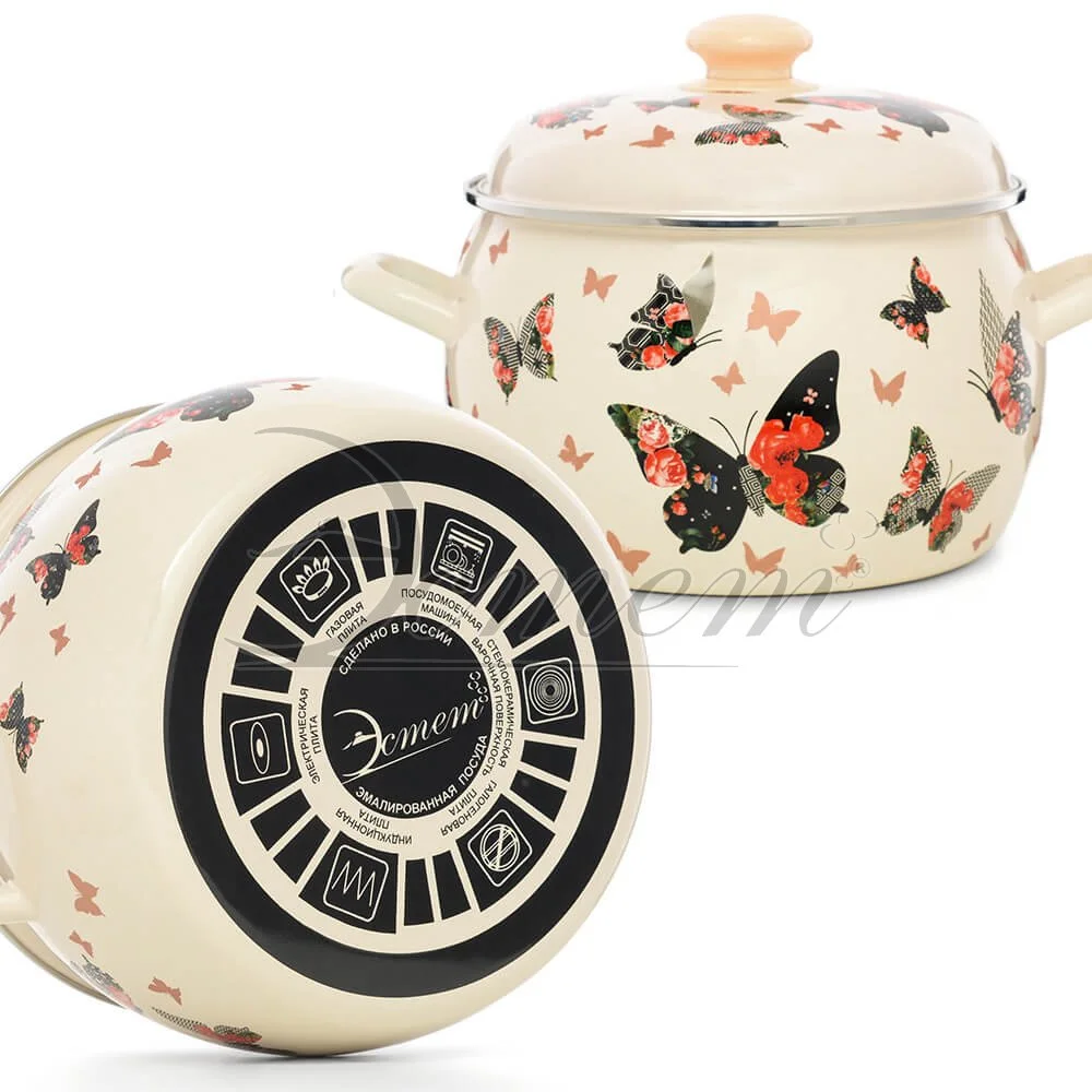 Кастрюля Эстет "Бабочки" изготовлена из высококачественного стального проката и покрыта стеклокерамической эмалью. Внутри и снаружи - трехслойное глянцевое эмалированное покрытие. Эмалевое покрытие, являясь стекольной массой, не вызывает аллергию и надежно защищает пищу от контакта с металлом. Кроме того, такое покрытие долговечно, оно устойчиво к механическому воздействию, не царапается и не "сходит", а стальная основа практически не подвержена механической деформации, благодаря чему срок эксплуатации увеличивается. Крышка с эмалированным покрытием оснащена удобной ручкой, . Она плотно прилегает к краю, сохраняя аромат блюд. Подходит для всех типов плит, включая индукционные. Можно мыть в посудомоечной машине.