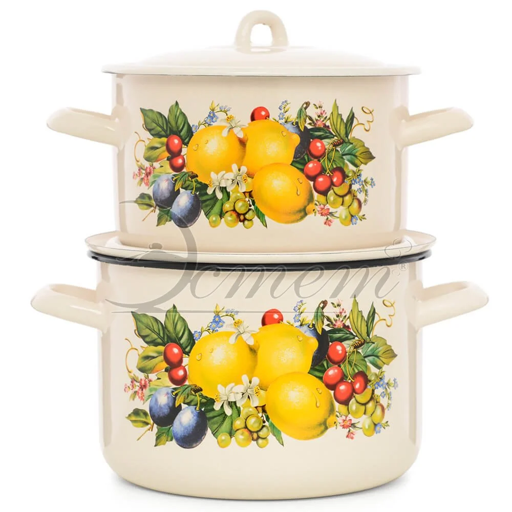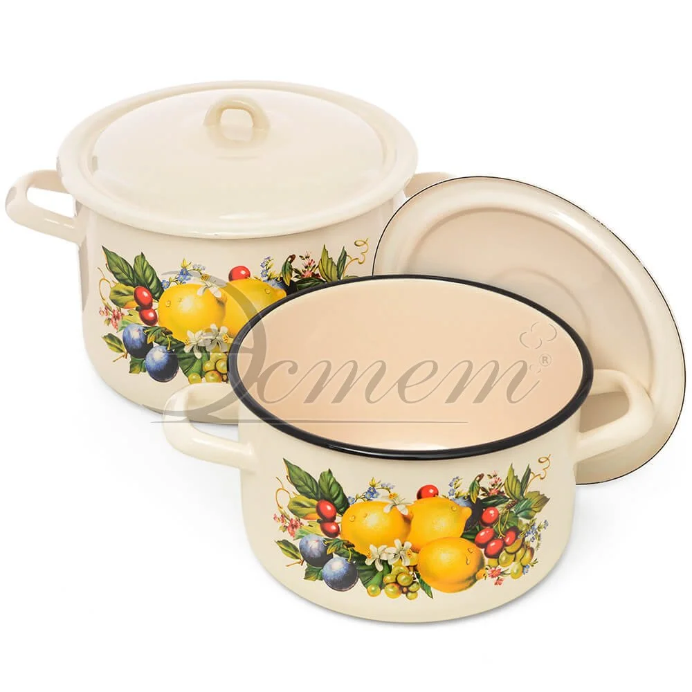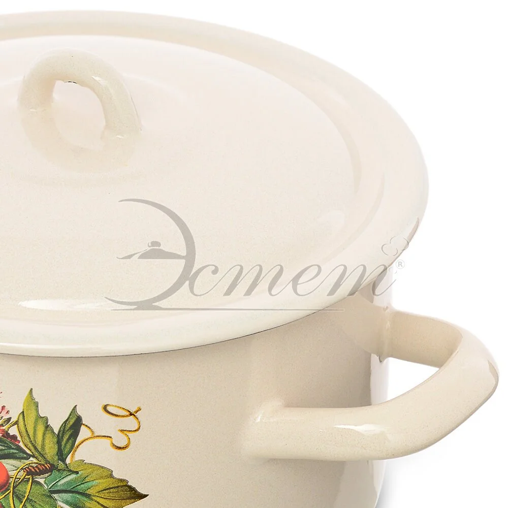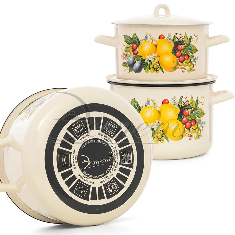 Набор посуды Эстет изготовлен из высококачественного стального проката и покрыта стеклокерамической эмалью. Внутри и снаружи - трехслойное глянцевое эмалированное покрытие. Эмалевое покрытие, являясь стекольной массой, не вызывает аллергию и надежно защищает пищу от контакта с металлом. Кроме того, такое покрытие долговечно, оно устойчиво к механическому воздействию, не царапается и не "сходит", а стальная основа практически не подвержена механической деформации, благодаря чему срок эксплуатации увеличивается. Крышка с эмалированным покрытием оснащена удобной ручкой. Она плотно прилегает к краю, сохраняя аромат блюд. Подходит для всех типов плит, включая индукционные. Можно мыть в посудомоечной машине.