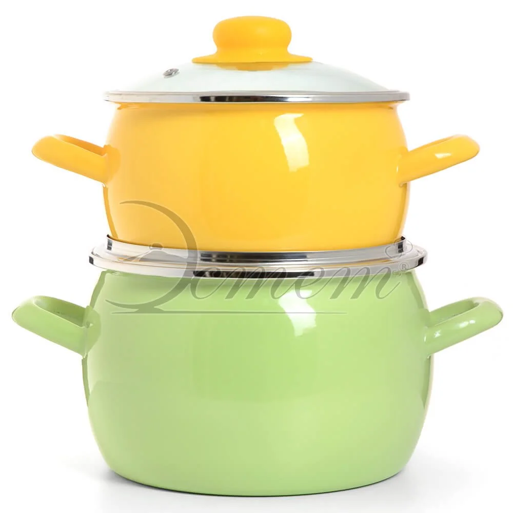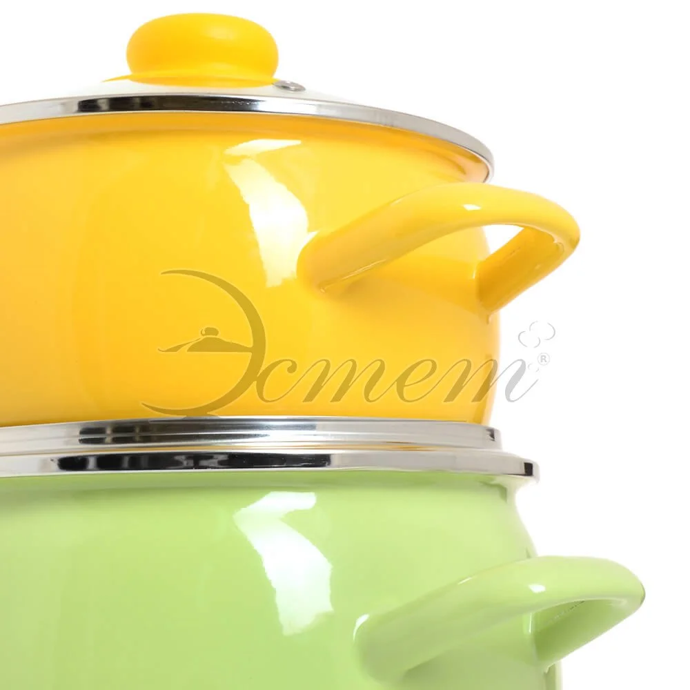 Набор посуды Эстет изготовлен из высококачественного стального проката и покрыта стеклокерамической эмалью. Внутри и снаружи - трехслойное глянцевое эмалированное покрытие. Эмалевое покрытие, являясь стекольной массой, не вызывает аллергию и надежно защищает пищу от контакта с металлом. Кроме того, такое покрытие долговечно, оно устойчиво к механическому воздействию, не царапается и не "сходит", а стальная основа практически не подвержена механической деформации, благодаря чему срок эксплуатации увеличивается. Она плотно прилегает к краю, сохраняя аромат блюд. Подходит для всех типов плит, включая индукционные. Можно мыть в посудомоечной машине.