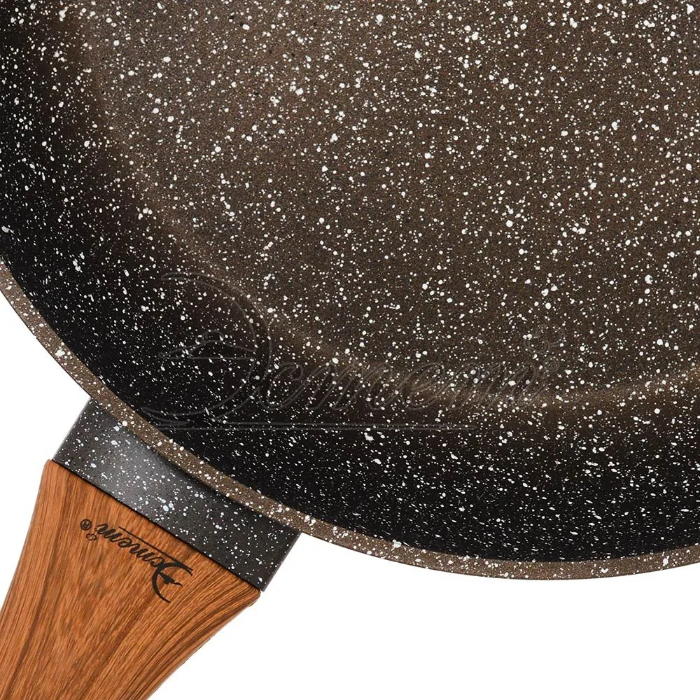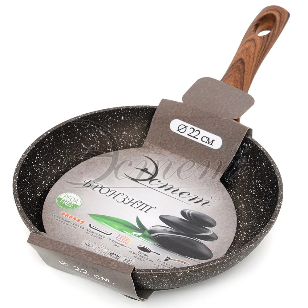 Сковорода ТМ «Эстет» создана, чтобы удовлетворить потребности самых взыскательных кулинаров и профессиональных шеф-поваров. Это результат сочетания современного дизайна, непревзойденного качества и использования передовых сертифицированных материалов. Сковорода изготовлена из литого алюминия с высококачественным антипригарным покрытием. Эргономичная ручка с покрытием «soft-touch» декорированная «под дерево» не нагревается в процессе приготовления пищи и не дает вашим рукам обжечься. Подходит для использования на всех типах плит, включая индукционные.