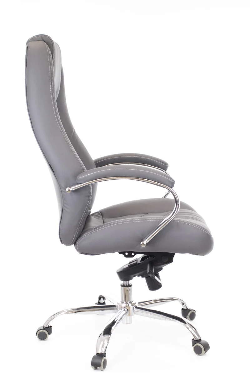 Модель серого цвета в обивке из искусственной кожи имеет нестандартную спинку и идеальные по форме подлокотники с мягкими накладками. Кресло оснащается дополнительной поддержкой в области головы, что обеспечивает максимальный комфорт во время длительной эксплуатации. Изделие может использоваться как на твердом напольном покрытии, так и на паркете благодаря устойчивой металлической крестовине и роликам с пластиковыми деталями.