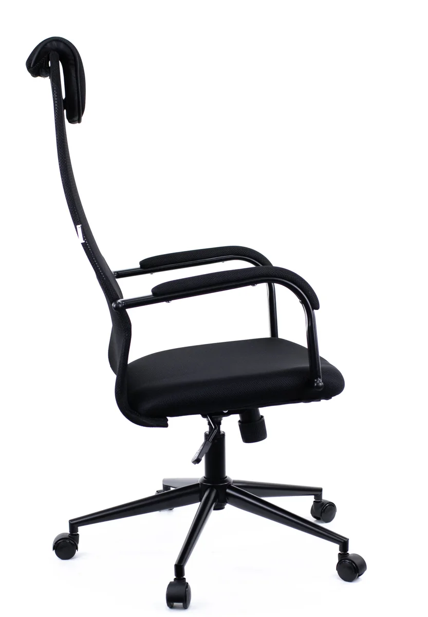 Конструкция имеет удобное приспособление для качания, с возможностью регулирования положения кресла. Крестовина и подлокотники сделаны из черной стали. Обивка состоит из сетки и ткани, которые являются практичным и долговечным материалом. Сидячая работа приводит к дискомфорту в пояснице и спине. Для комфортного пребывания в кресле целый день, продуман удобный подголовник и изогнутая форма спинки, поддерживающая правильную осанку. Сиденье удобное, мягкое.