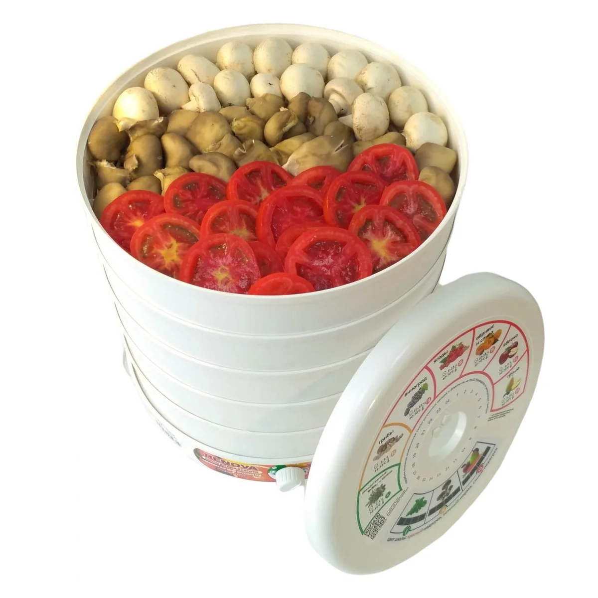 тип: конвективная, материал поддонов: непрозрачный пластик, число поддонов: 5, мощность: 516 Вт, регулировка температуры сушки, управление: механическое, особенности: защита от перегрева, дополнительные функции: приготовление пастилы