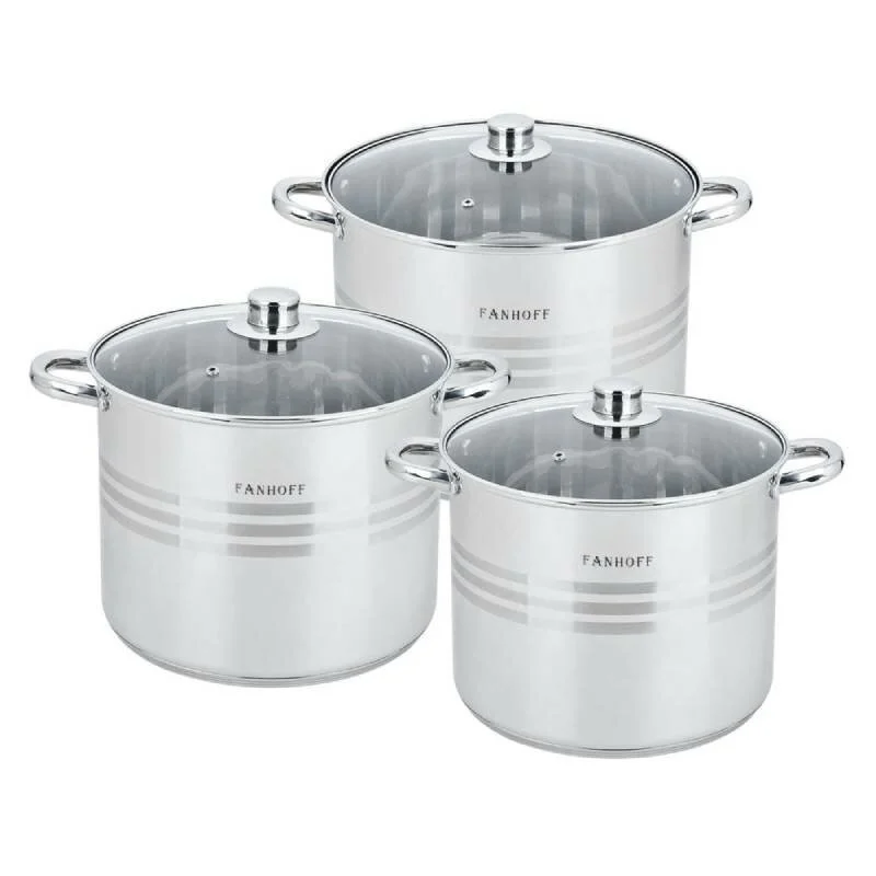 Набор посуды FANHOFF FH-68438 состоит из трёх кастрюль объёмом 8,5 л, 10,5 л, 13 л.