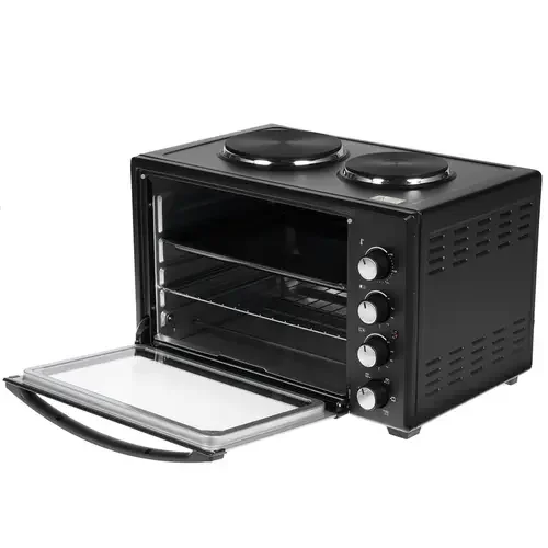 Черная электропечь First FA-5045-4 станет верной помощницей на вашей кухне. Она прекрасно подходит для использования в малогабаритных помещениях. Эта модель объединила в своем корпусе духовой шкаф и плиту. С ее помощью можно оперативно приготовить любые блюда.