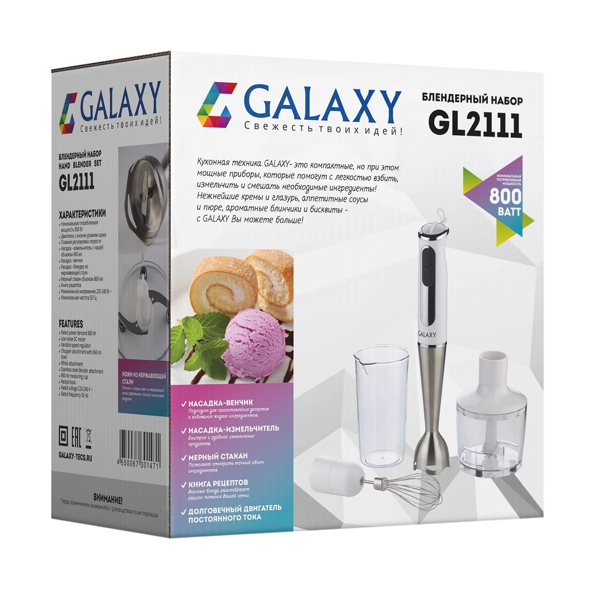 Блендерный набор GALAXY GL2111 включает в себя погружной блендер из нержавеющей стали, насадку-венчик,