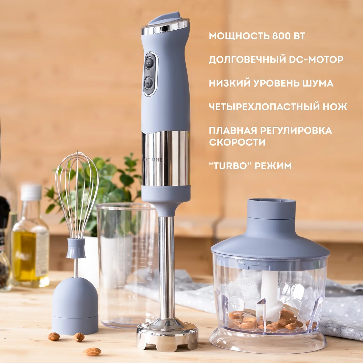 Блендерный набор GALAXY LINE GL2121 предназначен для взбивания, измельчения и смешивания ингредиентов. Набор включает несколько насадок и предметов: измельчитель (чоппер), погружной блендер, венчик, мерный стакан. Насадка-измельчитель с пластиковой чашей объемом 0,5 литра позволит Вам быстро измельчить овощи для салата или супа, превратить мясо или рыбу в фарш, приготовить паштет и многое другое. Погружной блендер из высококачественной нержавеющей стали имеет четырехлопастный нож, который долго держит заточку и быстро измельчает даже горячие и твердые продукты. Плавная регулировка скорости обеспечивает качественное измельчение, взбивание и смешивание ингредиентов различной плотности, а режим «TURBO» не оставляет шанса ни одному комочку. В наборе также присутствует насадка-венчик, с помощью которой Вы легко и быстро сможете взбить сливки, яйца, приготовить крем и жидкое тесто. Мерный стакан объемом 0,5 литра удобен как для измерения объема жидкостей и сыпучих продуктов, так и для взбивания в нем кремов, муссов, соусов, жидкого теста и др. Высокую производительность и долгий срок службы блендерного набора GALAXY LINE обеспечивает номинальная мощность 800 Вт и профессиональный DC мотор с низким уровнем шума. GL2121 имеет эргономичный корпус и выполнен из экологически безопасного пищевого матированного пластика, на котором практически не заметны загрязнения и следы от капель воды. В комплекте с набором идет книга рецептов, с помощью которой Вы откроете для себя новые блюда и потрясающие рецепты! Позвольте себе лучшее с высокотехнологичной техникой GALAXY LINE!