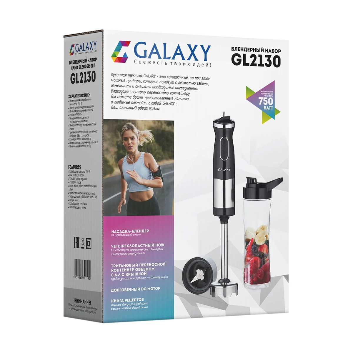 Блендерный набор GALAXY GL2130 имеет высокую мощность 750 Вт и долговечный DC-мотор постоянного тока.