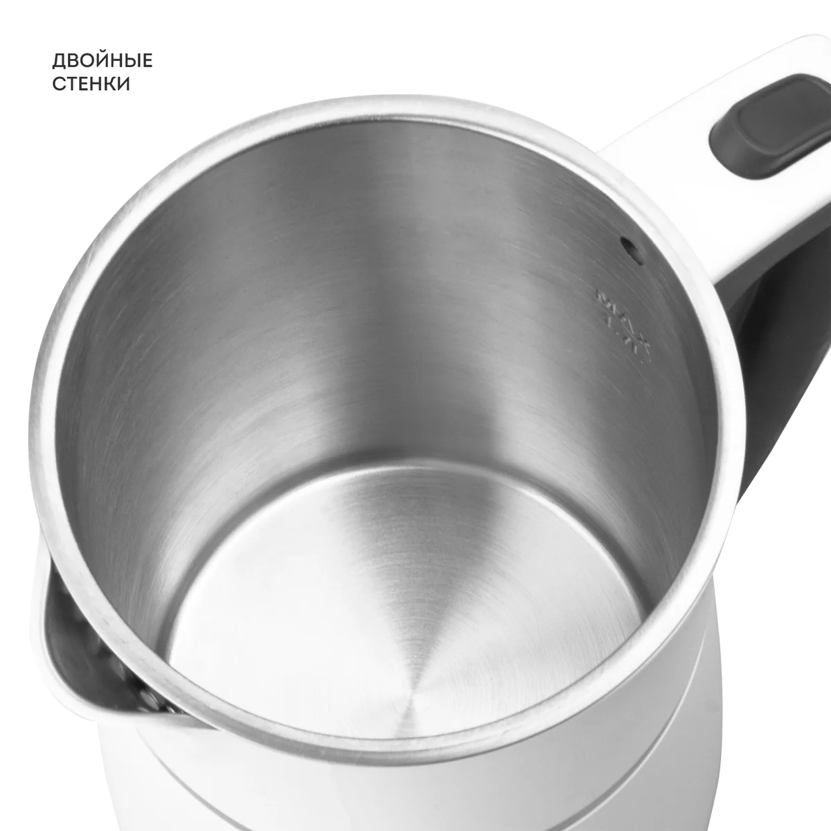 Чайник имеет двойные стенки из нержавеющей стали марки 18/10 и пищевого пластика.