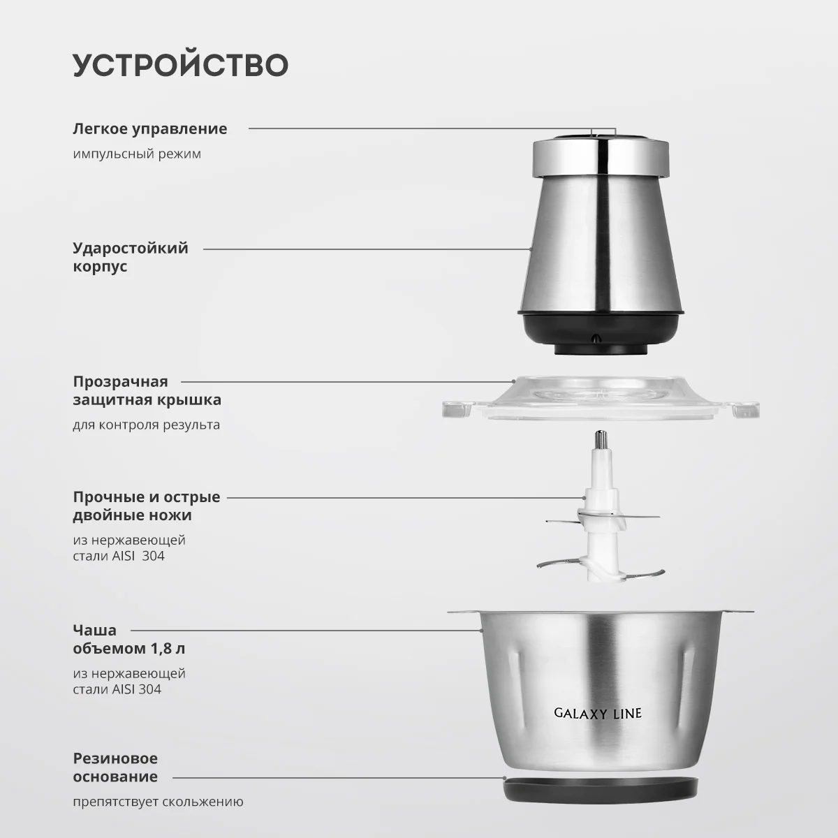 Измельчитель кухонный электрический GALAXY LINE GL2380 - многофункциональный прибор, сочетающий в себе функции нарезки и измельчения.