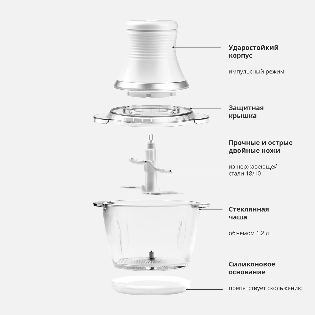 Силиконовое основание препятствует скольжению, надежно фиксирует чоппер на столе.