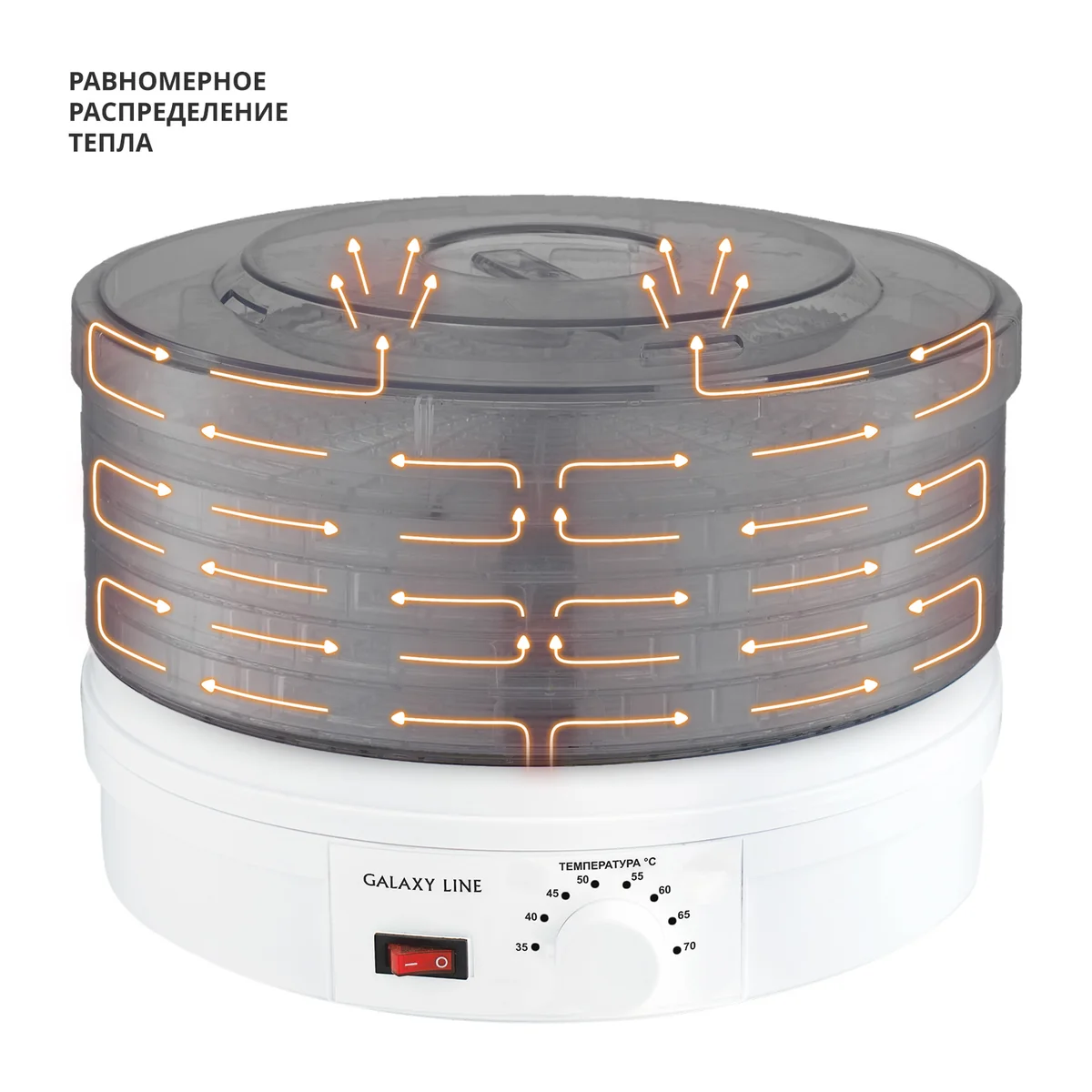 Благодаря идеальному соотношению нужной температуры и скорости обдува продукты просушиваются быстро и равномерно.