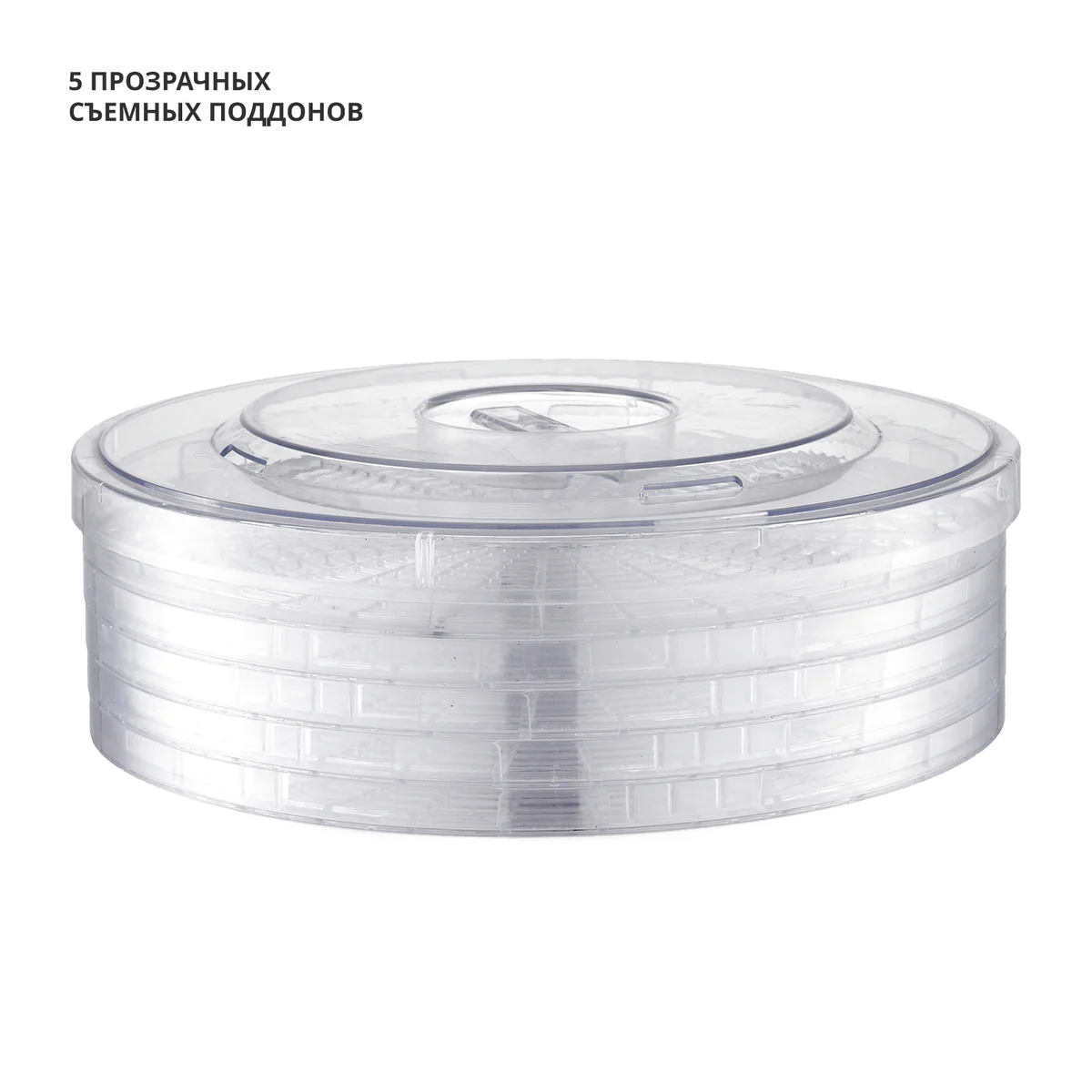 Пять прозрачных поддонов позволяют сушить несколько различных продуктов одновременно.
