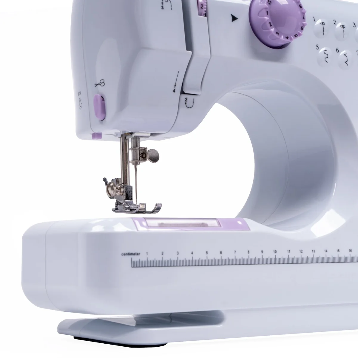 Дополнительные характеристики: 12 встроенных типов стежков и строчек / Пиктограммы строчек на передней панели / Регулировка натяжения нити / Выдвижной ящик для удобного хранения аксессуаров / Автоматическая намотка нити / Линейка на корпусе / Рукавная платформа / Подсветка рабочей зоны / Возможность работы от адаптера и батареек (не поставляются в комплекте)