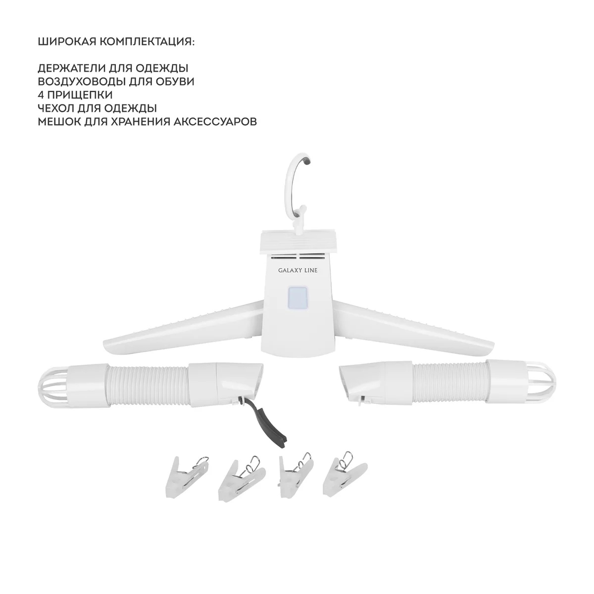 В комплекте поставляется специальный чехол для одежды на замке, 4 прищепки, вешалки для одежды, воздуховоды для обуви, а также мешок для хранения аксессуаров, что обеспечивает удобство эксплуатации.
