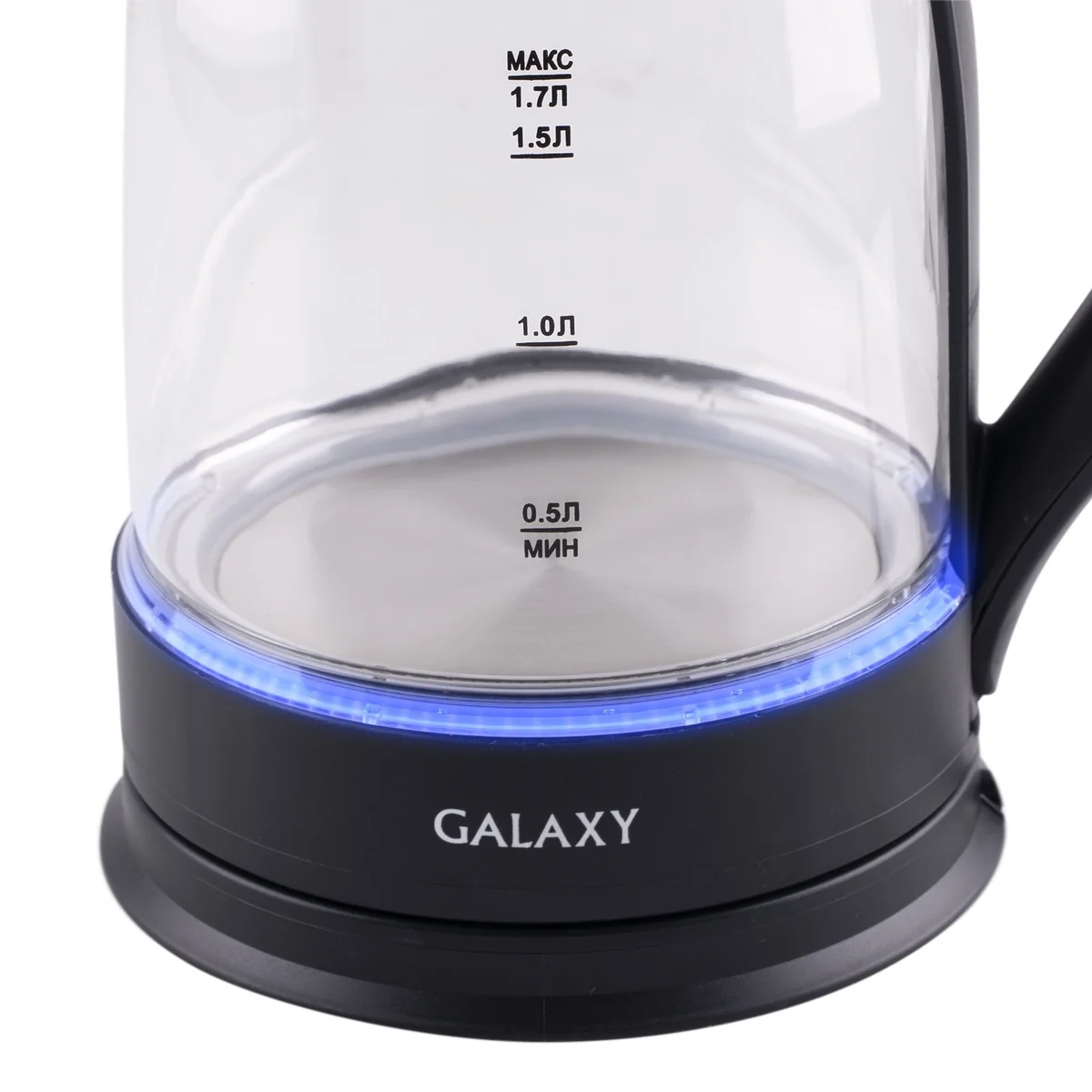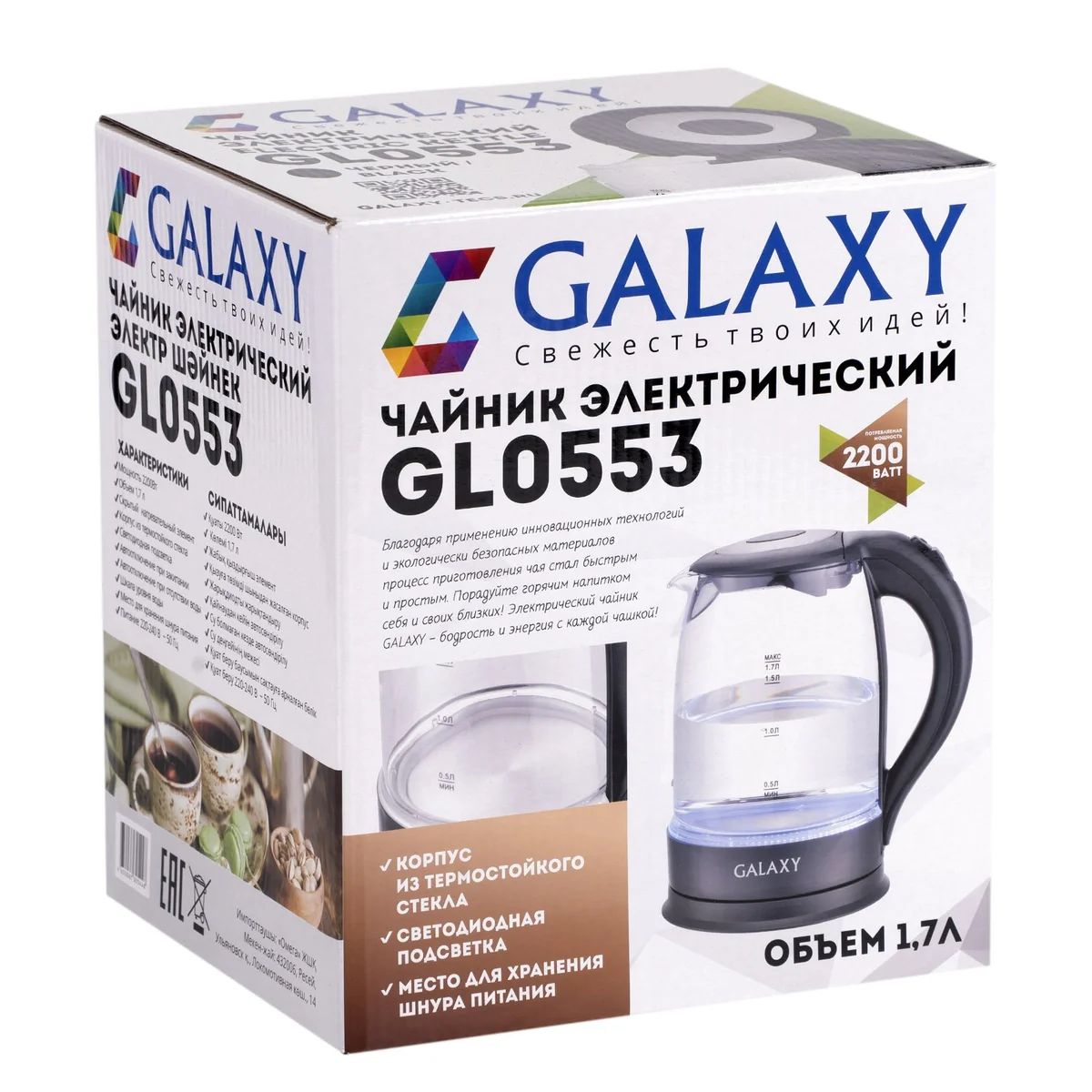 Чайник электрический GALAXY GL0553 имеет стильный дизайн, корпус из термостойкого стекла и светодиодную подсветку.