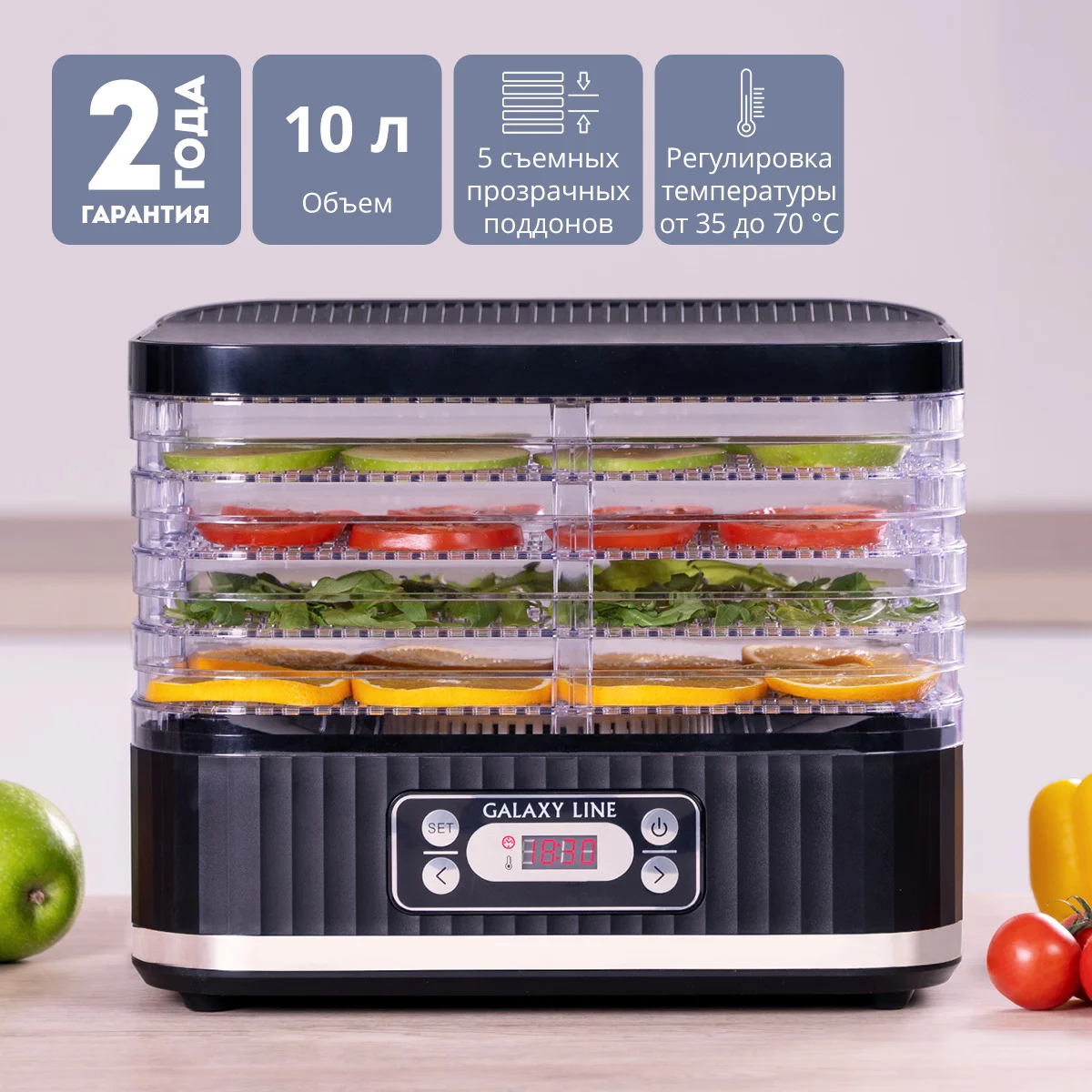 С электросушилкой GALAXY LINE GL2638 вы сохраните все полезные витамины и микроэлементы в продуктах.
