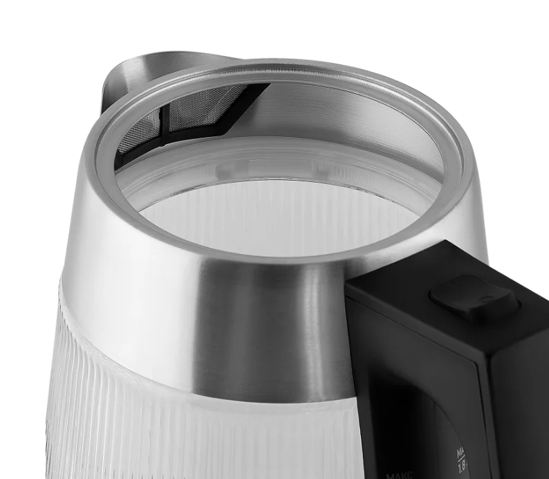Корпус из термостойкого стекла сохраняет чистый вкус воды и позволяет наблюдать процесс кипения. Фильтр из нержавеющей стали задерживает накипь и мелкие примеси, а шкала уровня воды делает наливание точным и удобным. Мягкая внутренняя подсветка создаёт уютную атмосферу и визуально подчёркивает процесс кипения.