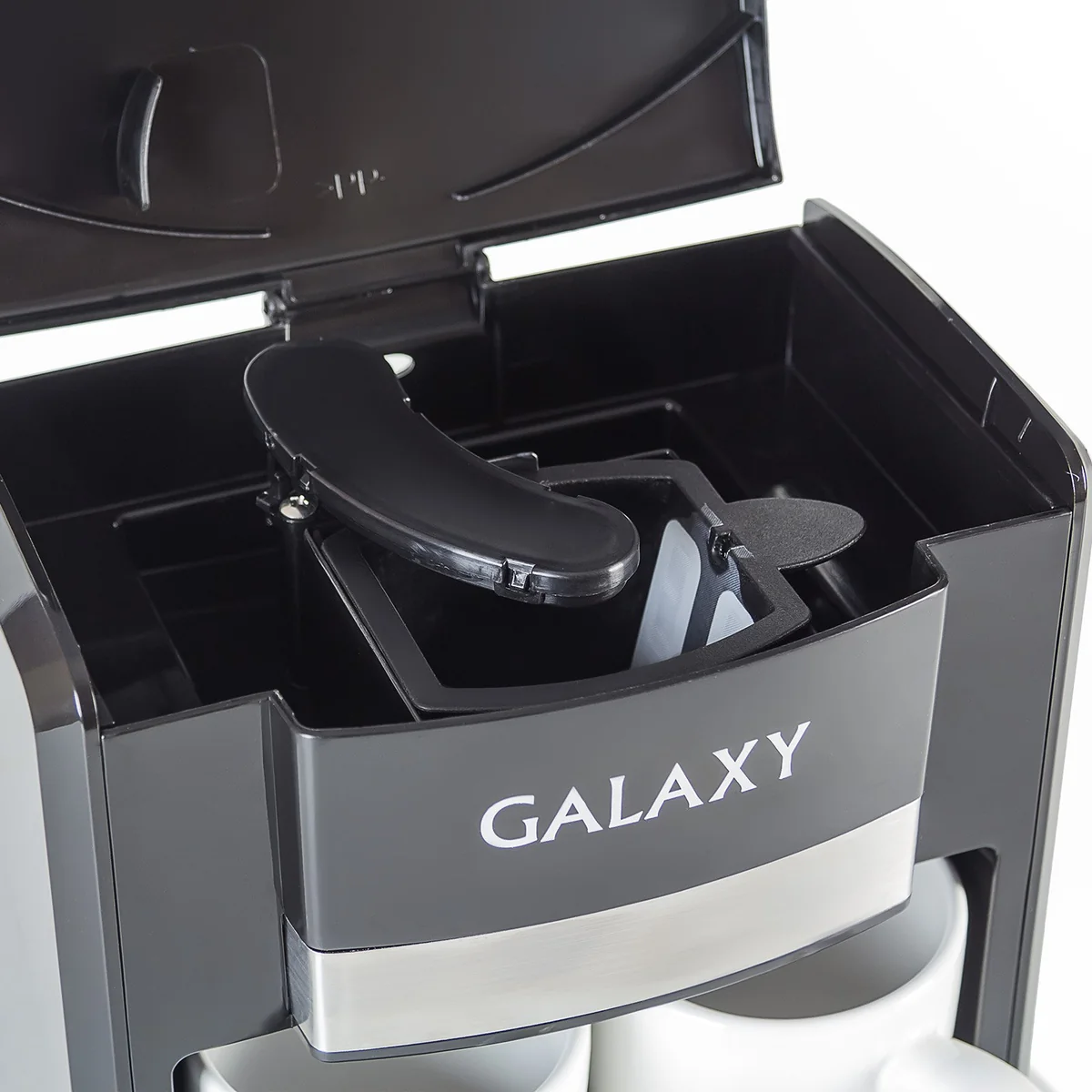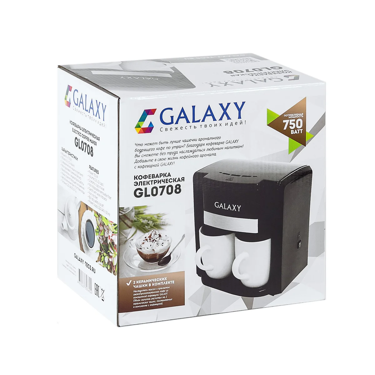 Стильная и компактная электрическая кофеварка GALAXY GL0708 идет в комплекте с двумя керамическими кружками.