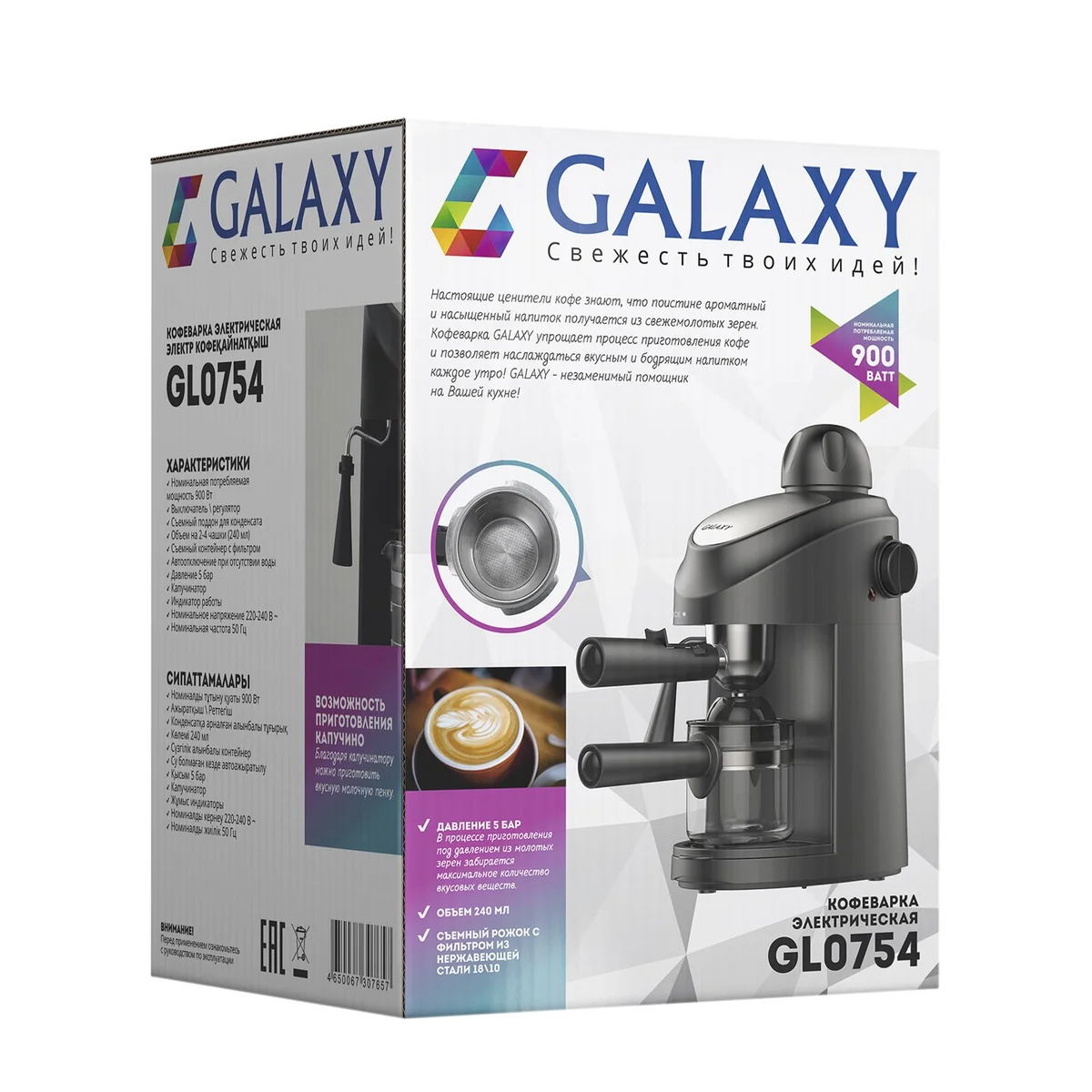 В рожковой кофеварке GALAXY можно приготовить классический эспрессо, латте, каппучино, глясе, ирландский кофе и др.
