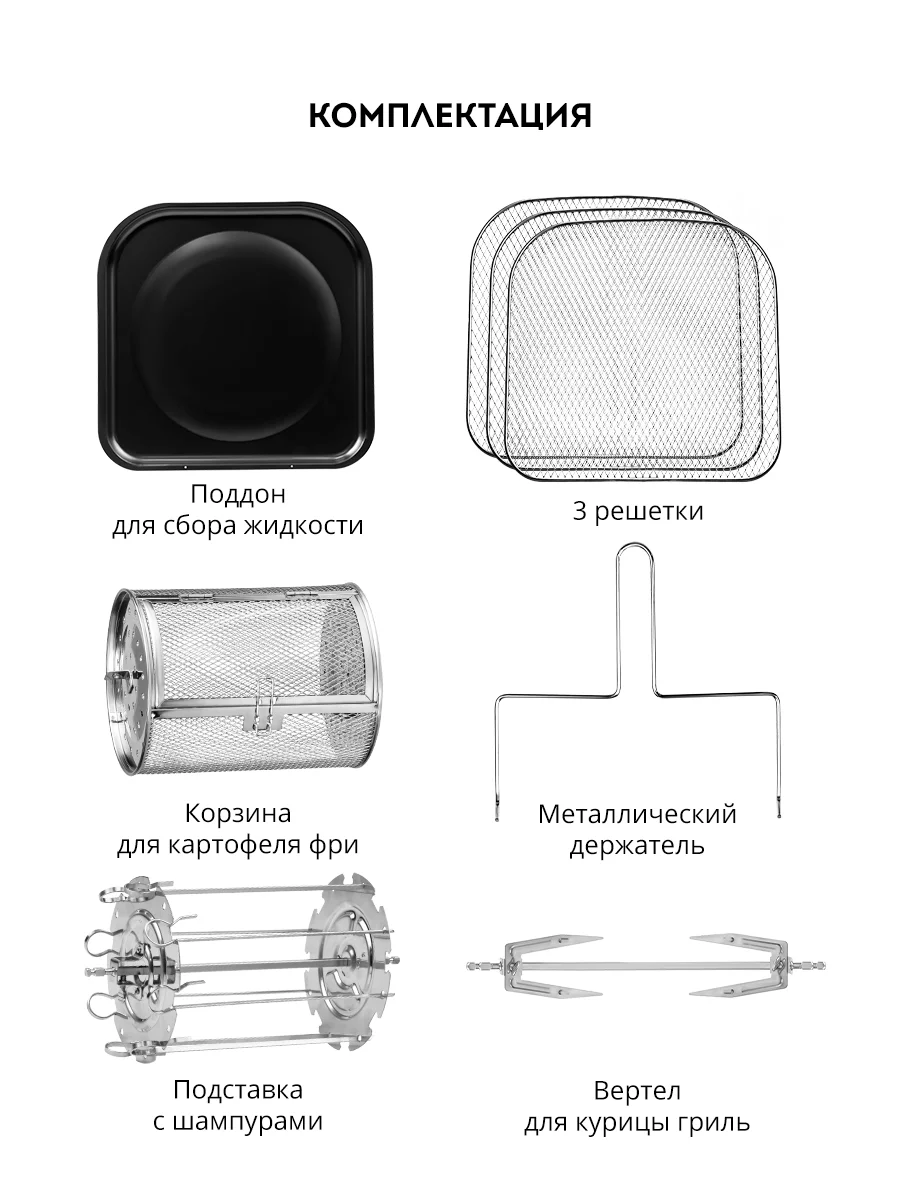 Вращающаяся корзина для картофеля фри, вертел для курицы-гриль с вилками для фиксации, вращающаяся подставка с шампурами, три решетки для запекания или сушки продуктов, поддон для сбора жидкости, металлический держатель, книга рецептов