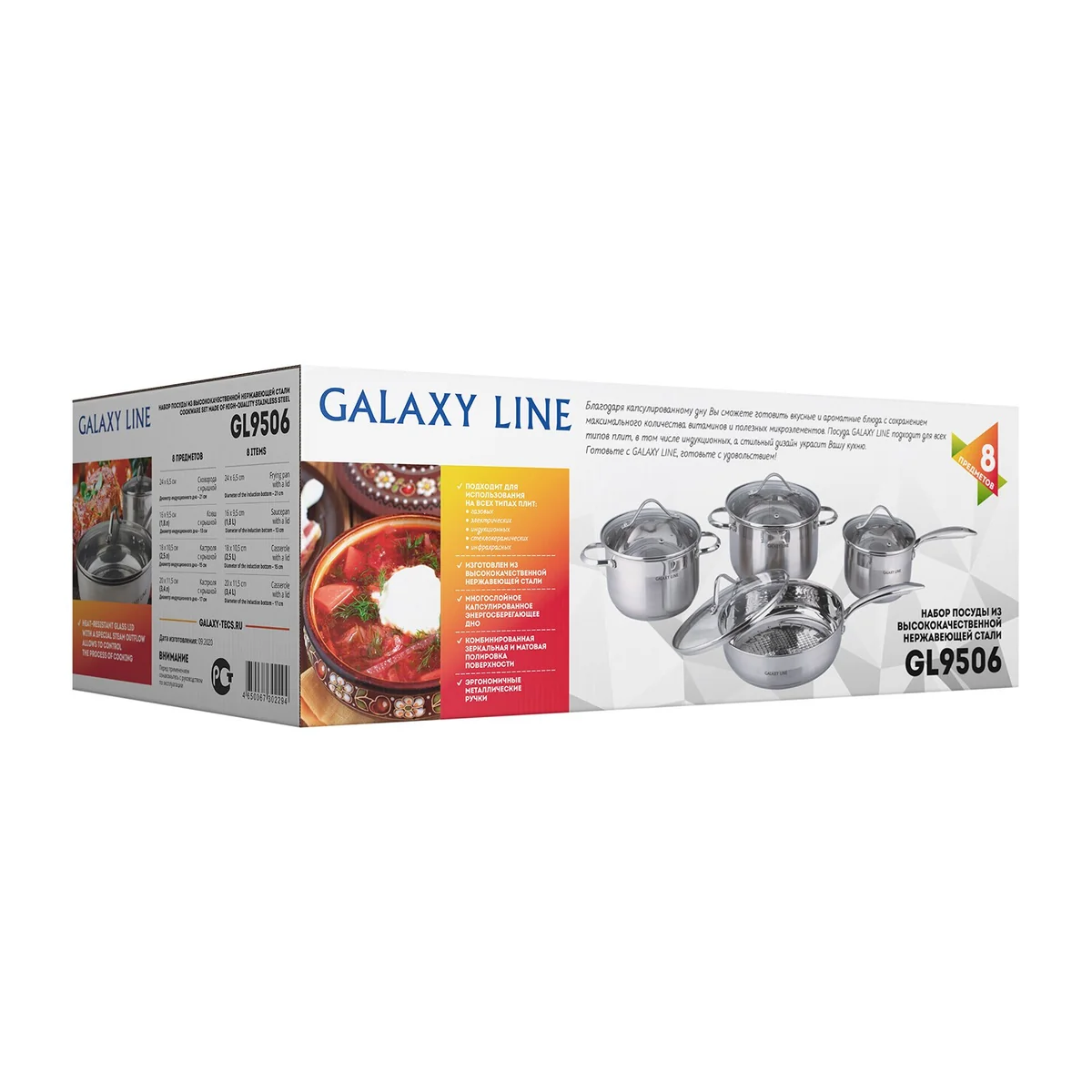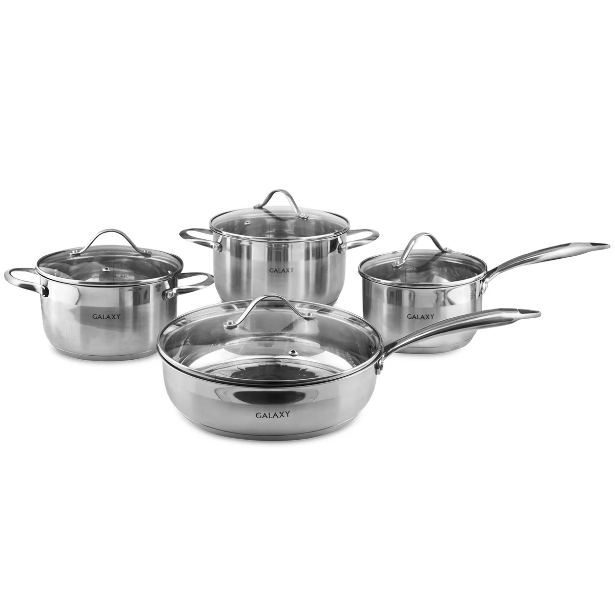 Набор посуды из нержавеющей стали GALAXY GL 9506 включает 8 предметов: 2 кастрюли, ковш, сковороду и крышки из жаропрочного стекла.