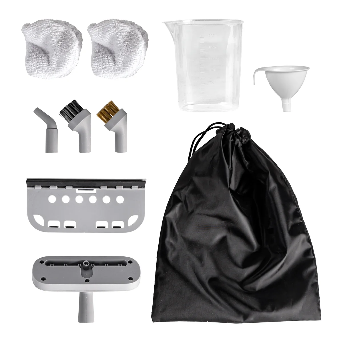 - Тряпка - 2 шт., коннектор для подсоединения насадок, воронка для наполнения бойлера водой, мешок для хранения аксессуаров, мерный стакан.