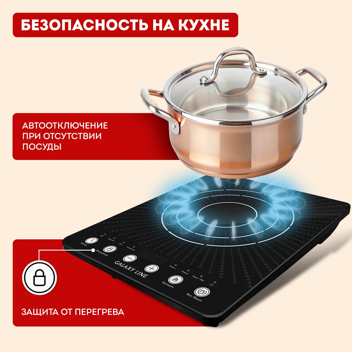 Безопасность при использовании GALAXY LINE GL3066 обеспечивают сразу несколько функций: блокировка от детей, защита от перегрева и автоматическое отключение при отсутствии посуды. Эти функции делают плитку идеальным выбором для семей с маленькими детьми.
