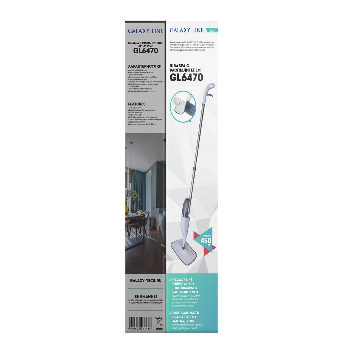 Швабра с распылителем GALAXY LINE GL6470 обеспечивает эффективную влажную уборку и мытье любых поверхностей пола. Встроенный пульверизатор позволяет помыть пол без применения ведра. Благодаря распылителю мелкий сор, волосы и шерсть животных скатываются в комочки на насадке и быстро устраняются с поверхности пола. Прибор имеет вместительный резервуар 450 мл, который можно наполнять водой и специальным моющим средством. Для распыления необходимо просто нажать на рукоятку. Дополнительным преимуществом данной модели является вращающаяся на 360° платформа для насадки. Она позволяет проникать в труднодоступные места и осуществлять эффективное мытье пола под мебелью, вдоль стен и плинтусов. В комплекте со шваброй GALAXY LINE идет насадка-тряпка из микрофибры размером 39 х 13 см. Мягкие волокна тряпки бережно удаляют загрязнения с любых напольных поверхностей: ламинат, паркет, линолеум, плитка и пр. Тряпка не оставляет разводов и ворсинок, хорошо впитывает воду, быстро высыхает и не скатывается. Специальная антискользящая ручка швабры удобно лежит в руке и обеспечивает надежный хват. В собранном виде прибор имеет оптимальный размер 127 см. Легкая и маневренная швабра GALAXY LINE GL6470 станет незаменимой помощницей в ежедневной уборке дома.