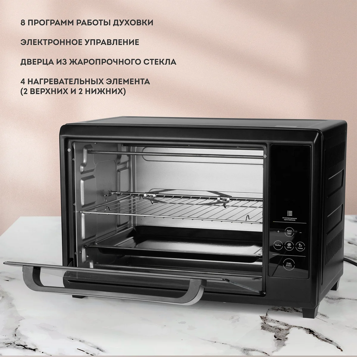 8 программ работы духовки, противень для выпечки, вертел и решетка-гриль