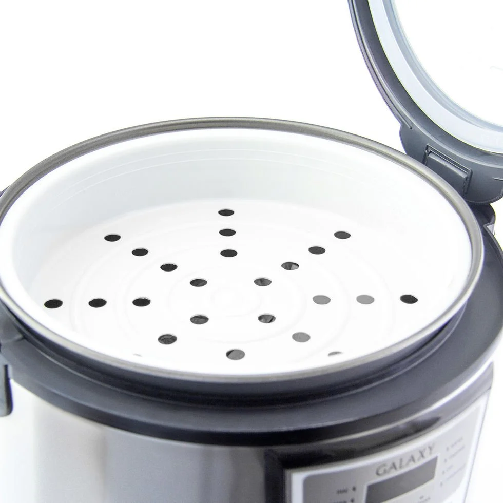 Мультиварка GALAXY GL2641 гармонично сочетает функциональность, качество, стиль, эргономику и безопасность. 11 программ, таймер и функция отложенного старта до 24 часов позволяют готовить широкую палитру блюд в любое удобное для Вас время. Объем чаши 5 литров дает возможность готовить сразу на всю семью. Эргономика прибора выражена в электронном управлении и наличии светодиодного дисплея. Клапан для выпуска пара, антипригарное покрытие, равномерный нагрев, ёмкость для сбора конденсата – всё это добавляет комфорта при пользовании мультиваркой.