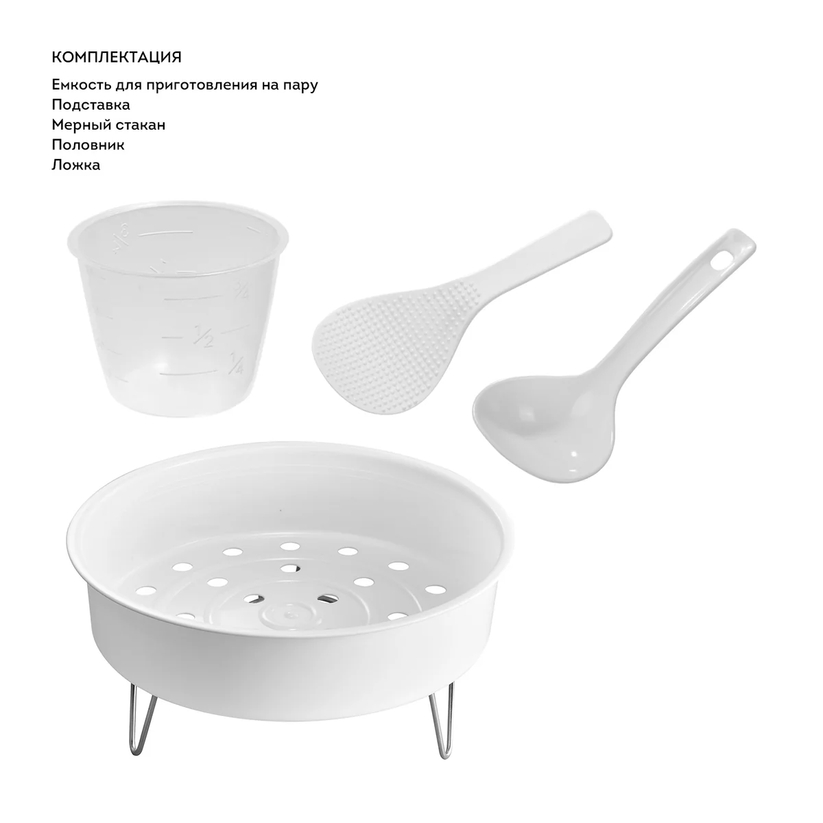 В комплекте: ложка, мерный стакан, емкость для приготовления на пару, половник, подставка.
