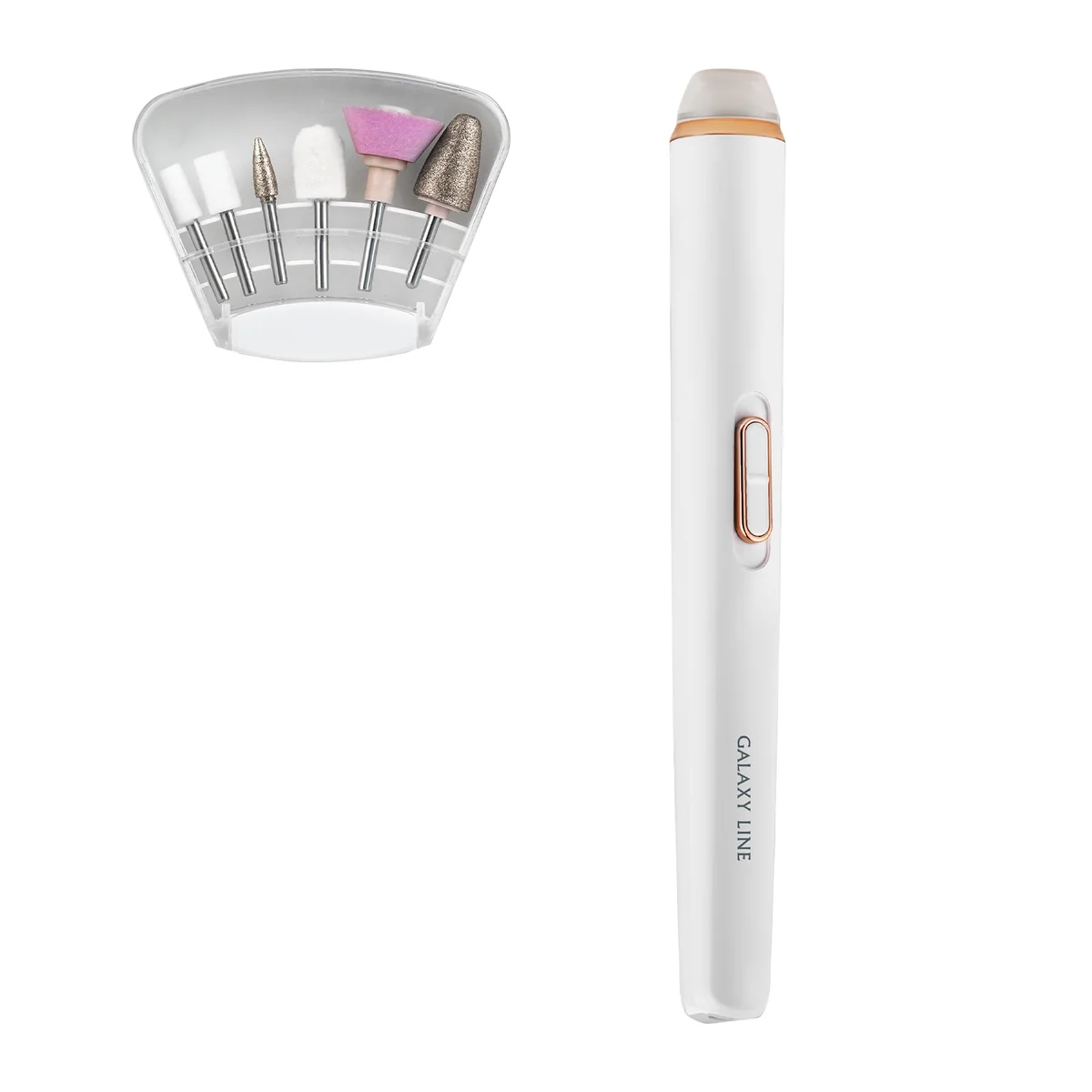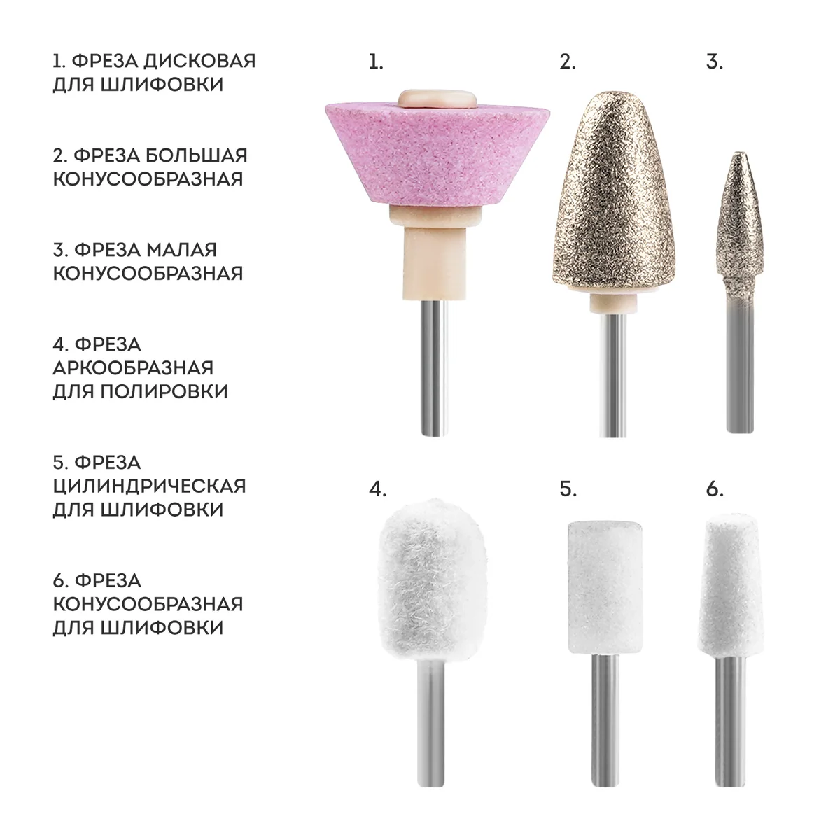 Набор состоит из привода и 6 съемных фрез с разным покрытием, которые подходят для полировки ногтей с боковых сторон, придания формы и сглаживания края, шлифовки гладкого края среза, удаления и обработки кутикулы.