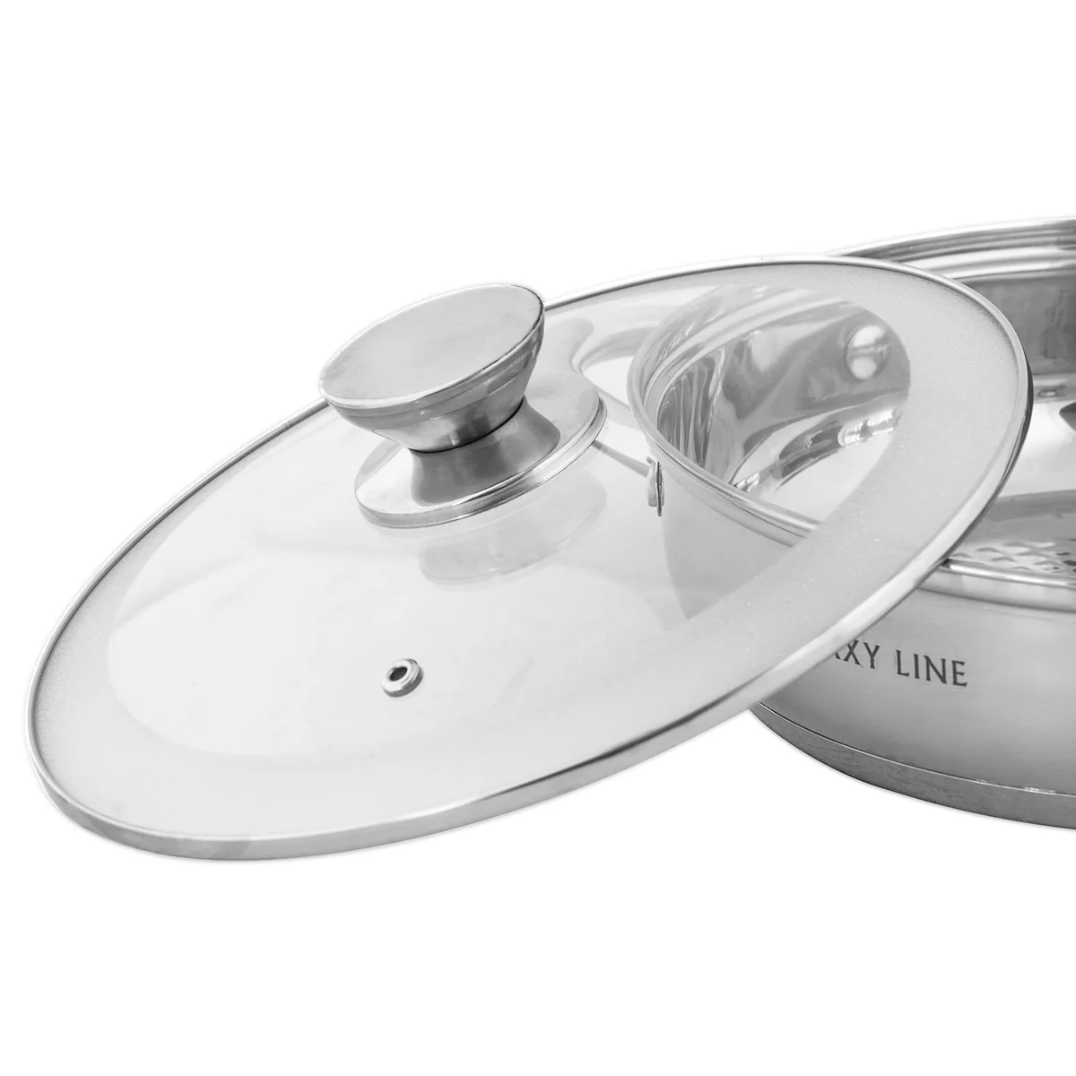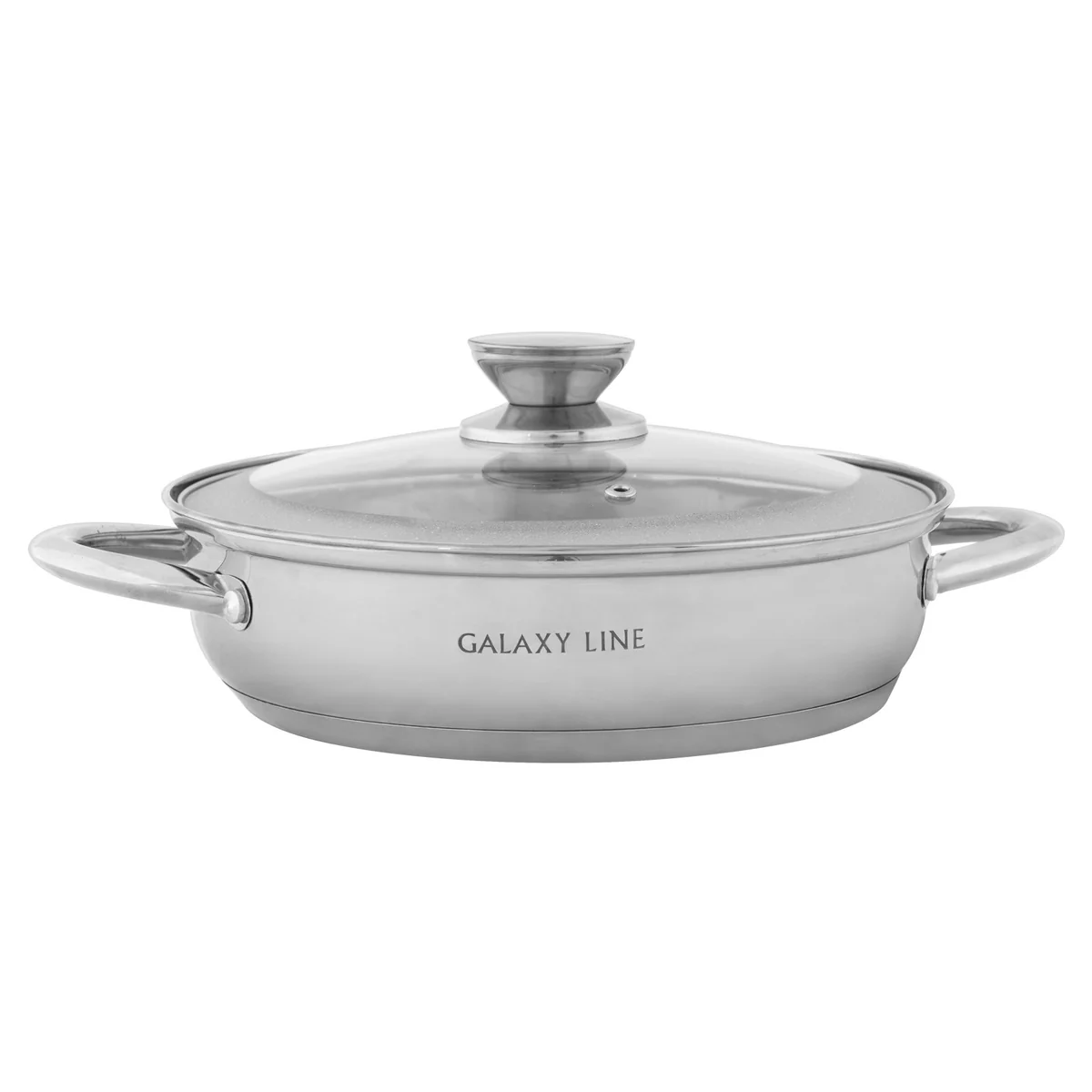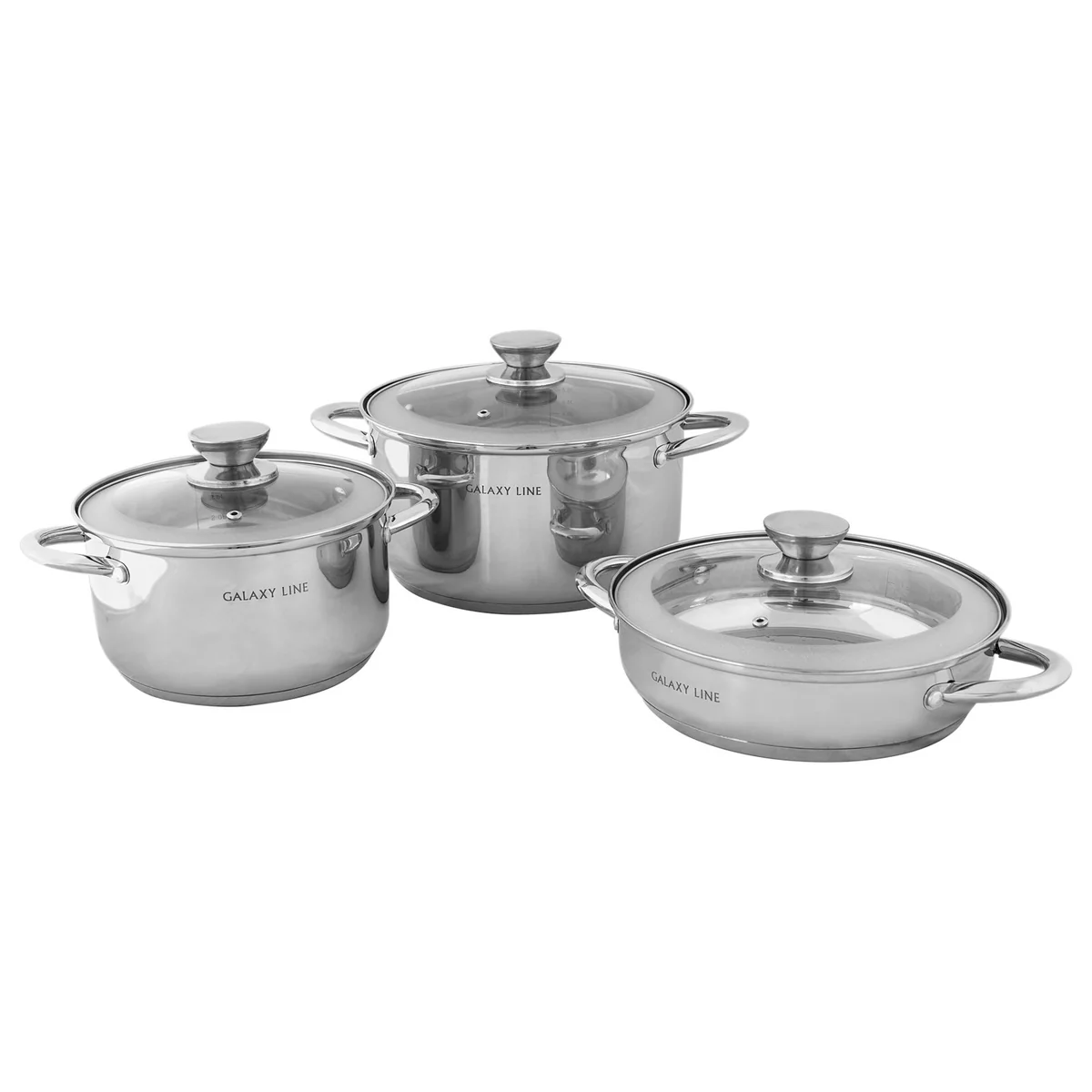 Набор посуды из нержавеющей стали GALAXY GL 9505 включает 2 кастрюли, сковороду-сотейник и крышки из жаропрочного стекла.