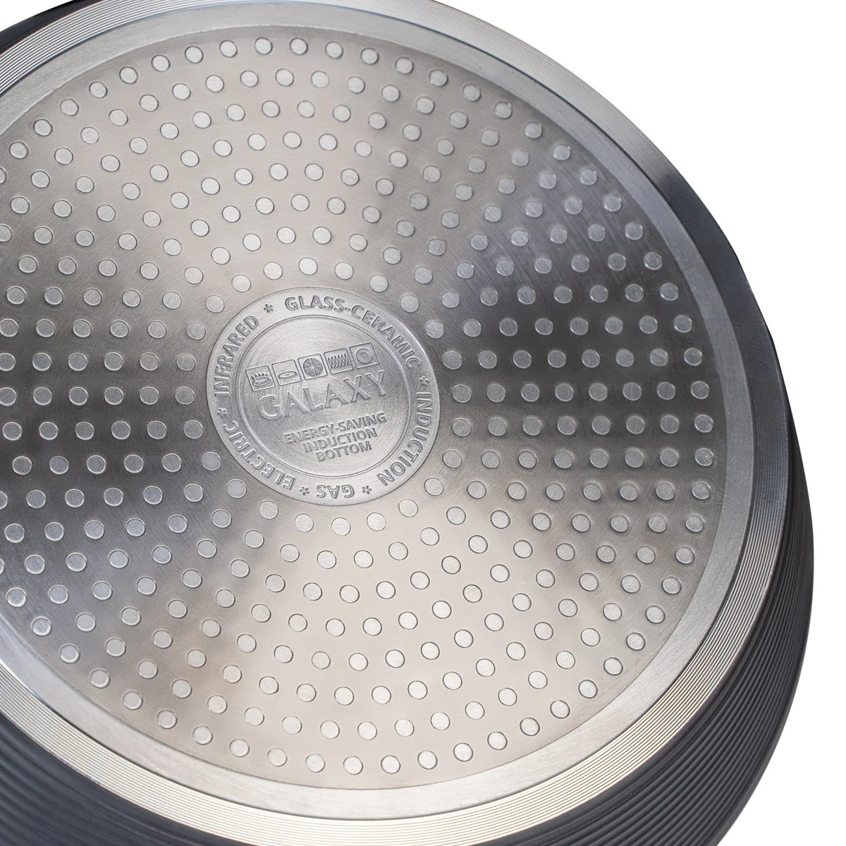 Дополнительным преимуществом набора посуды GALAXY LINE GL9509 является универсальная крышка, которая подходит как для кастрюли, так и для сковороды.