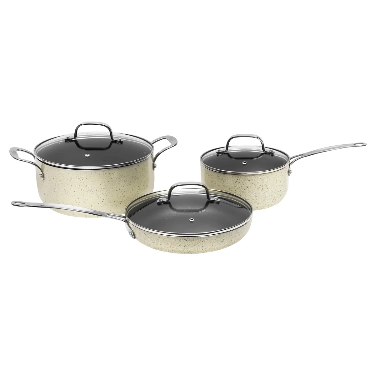 Набор посуды GALAXY LINE GL9513 включает 6 предметов: кастрюля объемом 4,7 литра (24 х 11,5 см) с крышкой, ковш объемом 2,1 литра (18 х 9 см) с крышкой, сковорода (24 х 4,8 см) с крышкой. Вся посуда выполнена из высококачественного алюминия толщиной 2,7 мм, что обеспечивает долгий срок службы. Постепенный и равномерный нагрев позволяет готовить вкусные ароматные блюда, сохраняя максимальное количество витаминов и полезных микроэлементов. Набор посуды GALAXY LINE имеет специальное антипригарное покрытие, которое исключает подгорание и прилипание пищи, позволяя готовить с минимальным количеством масла. Крышки в наборе выполнены из термостойкого стекла с отверстием для выхода пара. Такая конструкция исключает образование конденсата и позволяет контролировать процесс приготовления. Все ручки в наборе посуды GL9513 выполнены из долговечной нержавеющей стали. Они прикручены, а не приварены, что обеспечивает долгий срок службы и отсутствие нагрева. Данный набор посуды подходит для газовых, электрических, инфракрасных и стеклокерамических плит. Стильный и практичный набор посуды GALAXY LINE GL9513 идеально впишется в интерьер Вашей кухни. Готовьте с удовольствием с GALAXY LINE!