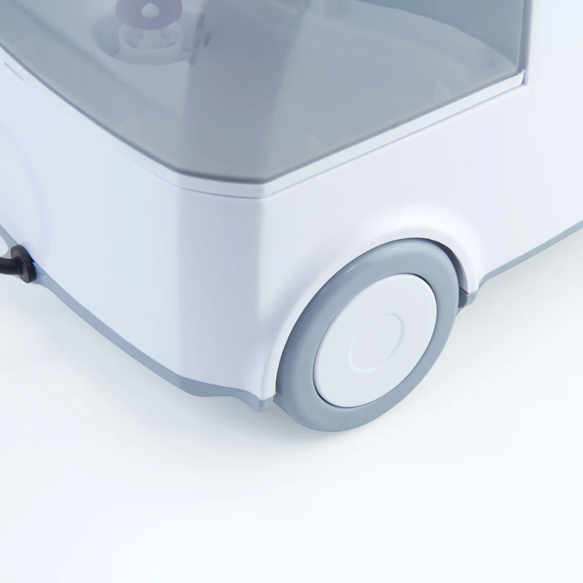 - Принадлежности: трехсекционная телескопическая стойка, теплоизоляционный шланг для подачи пара, колесики для удобства перемещения, щетка для очистки, складная вешалка для одежды с подставкой для утюжка