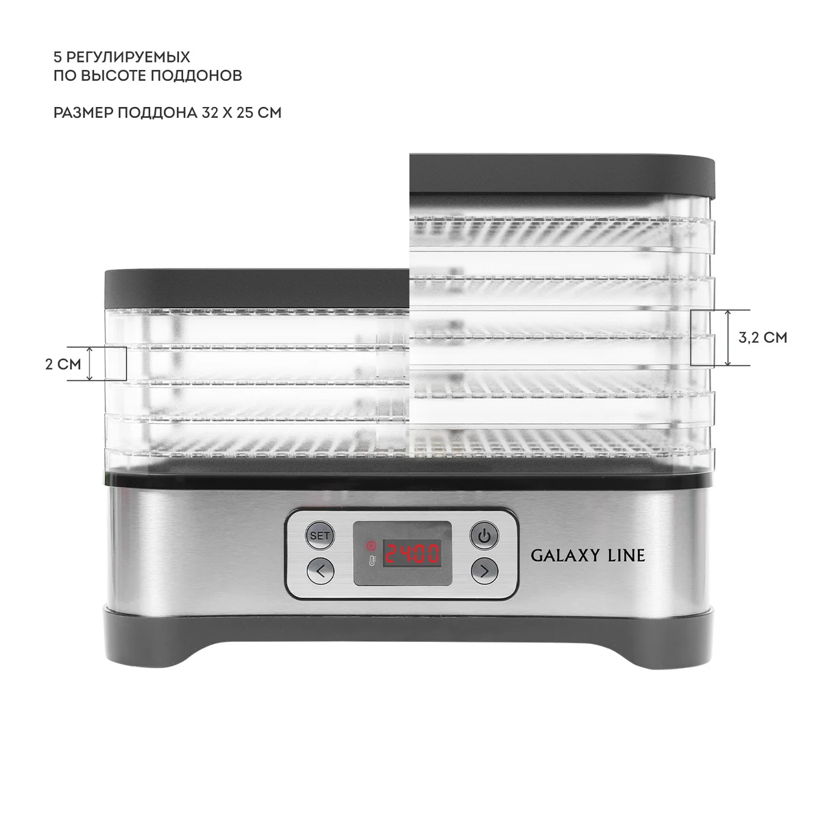 5 регулируемых по высоте съемных секций позволяют разместить в небольшом объеме максимум продуктов и добиться их наилучшего распределения для быстрого и равномерного высушивания.