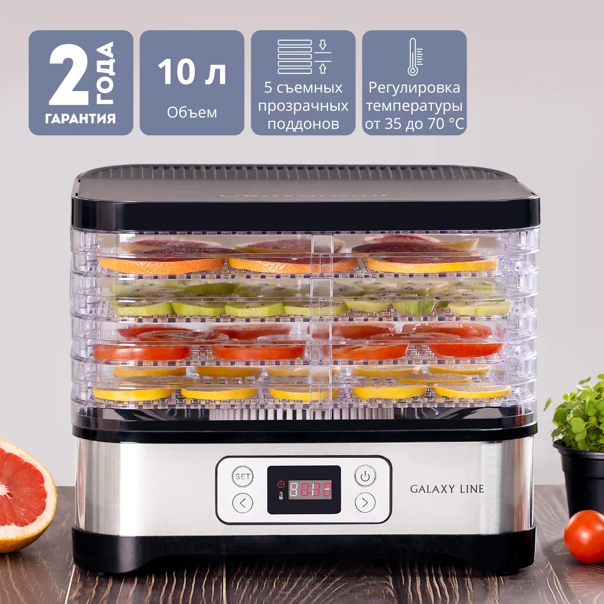 Электросушилка GL2640 позволяет заготавливать овощи и фрукты без использования консервантов с минимальной потерей полезных веществ, а также сушить лекарственные растения и пряные травы.