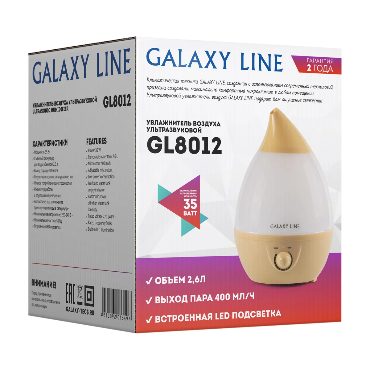 Увлажнитель ультразвуковой GALAXY LINE GL8012 - современный прибор для оптимизации микроклимата в сухом помещении. Проблемы с вентиляцией, отопление в зимний сезон и жаркая погода в летний сезон напрямую влияют на уровень влажности в доме. Пересушенный воздух может негативно сказаться на здоровье всех членов семьи, а также на животных, растениях и даже мебели и паркете. Увлажнитель GALAXY LINE использует эффективную современную технологию ультразвукового увлажнения - получения мельчайших частиц воды (холодного пара). Сухой воздух всасывается с помощью вентилятора, направляется через этот водяной туман, насыщается влагой, после чего возвращается в комнату. Прибор очень прост в эксплуатации - достаточно просто налить воду в съемный резервуар объемом 2,6 литра и включить прибор. Данный увлажнитель обеспечивает до 9 часов работы в непрерывном режиме, работает бесшумно и не расходует много электроэнергии, но в то же время имеет высокую производительность. GL8012 быстро увлажняет помещение площадью до 30 м². Регулятор интенсивности выхода пара позволяют подобрать оптимальный режим увлажнения. Выход пара в данной модели до 400 мл/ч. Автоматическое отключение при отсутствии в резервуаре воды гарантирует абсолютную безопасность. Бесспорным преимуществом данной модели является LED подсветка корпуса, что превращает увлажнитель в элегантный ночной светильник. Создайте неповторимый уют, идеальный микроклимат и ощущение свежести с ультразвуковым увлажнителем GALAXY LINE!