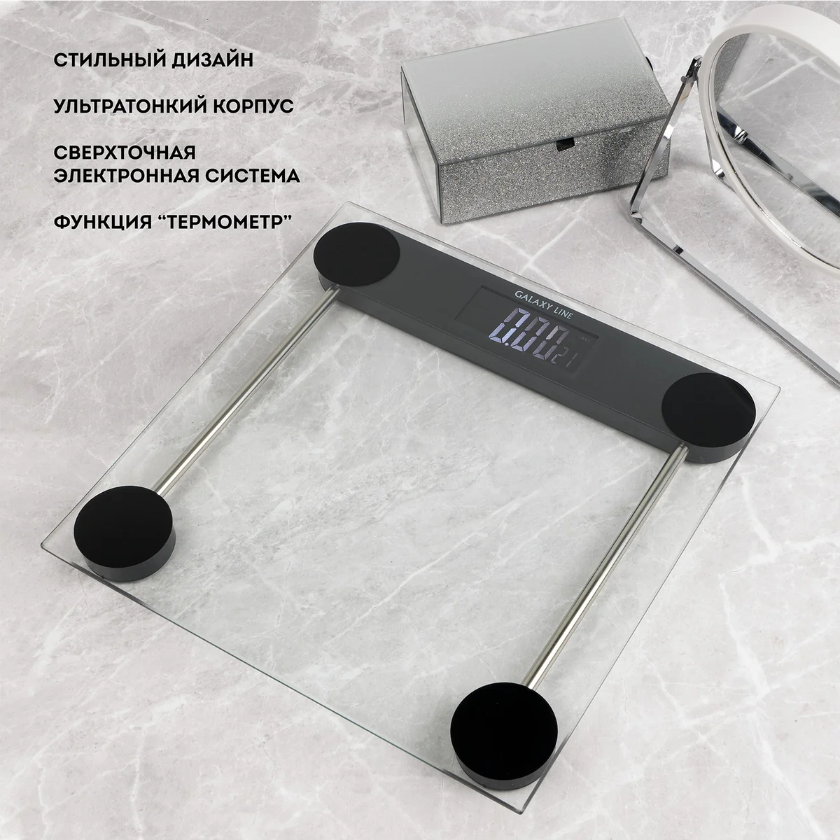 Весы напольные электронные GALAXY LINE GL4824 предназначены для определения массы тела. Прибор работает от элементов питания типа «ААА» (2 шт. в комплекте). Максимально допустимый предел взвешивания 180 кг. Наличие нескольких единиц измерения (килограмм, фунт) позволяет производить взвешивание в удобном формате. Весы оснащены сверхточной электронной системой датчиков. Цена деления в данной модели 50 г. Весы оснащены индикатором перегрузки и индикацией низкого заряда элемента питания, что обеспечивает удобство в эксплуатации. Автоматическое отключение позволяет экономить заряд элемента питания. Дополнительным преимуществом GALAXY LINE GL4824 является функция “Термометр”, которая позволяет измерять температуру помещения. Весы имеют лаконичный современный дизайн, ультратонкий корпус, платформа из высокопрочного стекла и большой светодиодный дисплей. Прорезиненные ножки надежно фиксируют прибор на поверхности, препятствуя скольжению. Позвольте себе лучшее с высокотехнологичной и долговечной техникой GALAXY LINE!