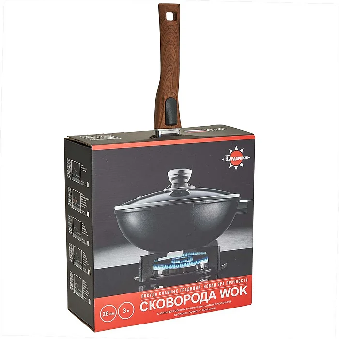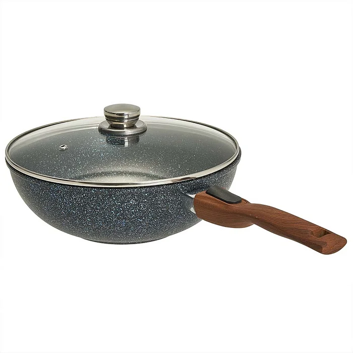 - Сковорода-вок литая алюминиевая с антипригарным покрытием, стеклянной крышкой и съемной ручкой
