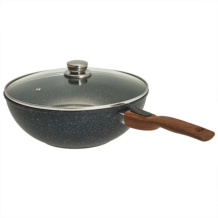- Сковорода-вок литая алюминиевая с антипригарным покрытием, стеклянной крышкой и съемной ручкой