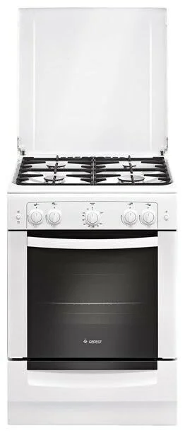 Газовая плита Gefest 6100-02 0009 с корпусом классического белого цвета имеет четыре газовые конфорки, различающиеся рабочей мощностью, и 52-литровую духовку со встроенным грилем.