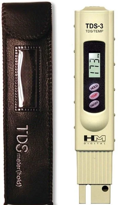 Переносной анализатор TDS-метр (солемер TDS-3) предназначен для измерения общего количества частиц (минерализация воды), растворенных в воде солей (TDS - total dissolved solids) на один миллион частиц воды — ppm (parts per million), а также и температуры воды. Кожаный чехол с клипсой на ремень входит в комплект поставки TDS измерителя. TDS-метр модели TDS-3 предназначен для бытовых и профессиональных целей измерения солесодержания и температуры воды в системах водоподготовки и очистки воды для гидропоники, аквариумов, бассейнов, а также анализа воды в скважинах и колодцах.