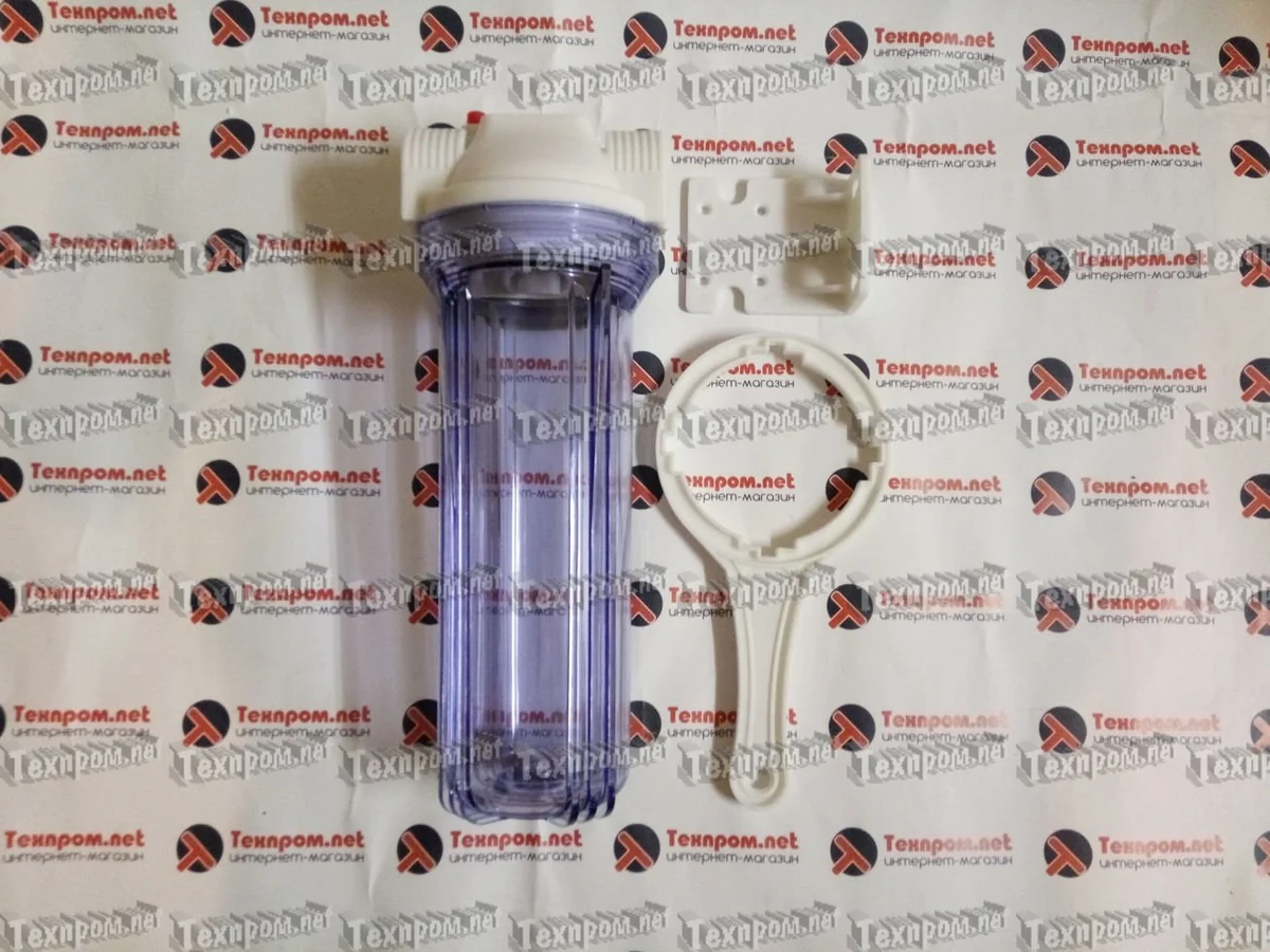 Корпус для магистрального фильтра Гейзер H10B 1/2". Прозрачный для холодной воды, кнопка сброса, латунные вставки, металлическая скоба, ключ.