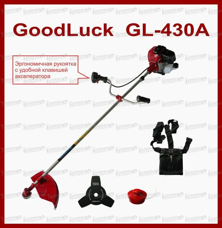GoodLuck Бензотриммер GL-430A+штанга предназначена для скоса травы и мелкого кустарника на относительно больших площадях, имеет возможность скоса травы на неровных участках и в труднодоступных местах (вблизи вертикальных поверхностей - стен, заборов, вокруг деревьев и столбов, а также под кустами и садовыми скамейками).