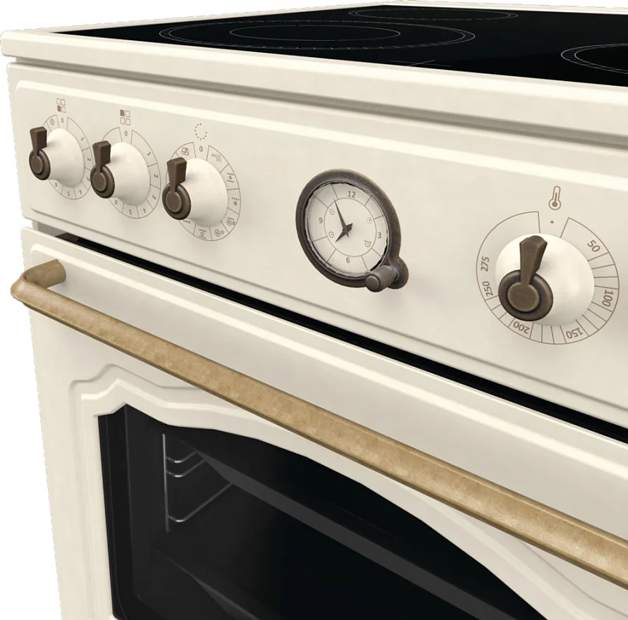 Электрическая плита Gorenje GECS6B70CLI — приятный сюрприз для любителей классики. Аристократический цвет слоновой кости, украшенный бронзированными аналоговыми аксессуарами, впишется в интерьер с налётом старины. В данной модели сочетается дизайн в стиле Ретро с современным функционалом и технологическими новинками, а электронное управление соседствует с поворотными переключателями. Часы показывают текущее время, а для выпекания можно установить нужную длительность приготовления.