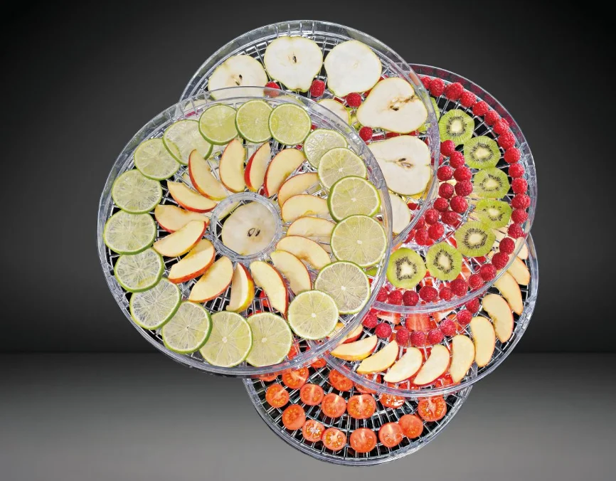 Подходит для различных продуктовПять лотков легко устанавливаются друг на друга. Высоту каждого лотка можно настраивать в соответствии с потребностями: на 2,8 или 5 сантиметров. Так, можно одновременно сушить овощи, фрукты, травы, хлеб, макаронные изделия