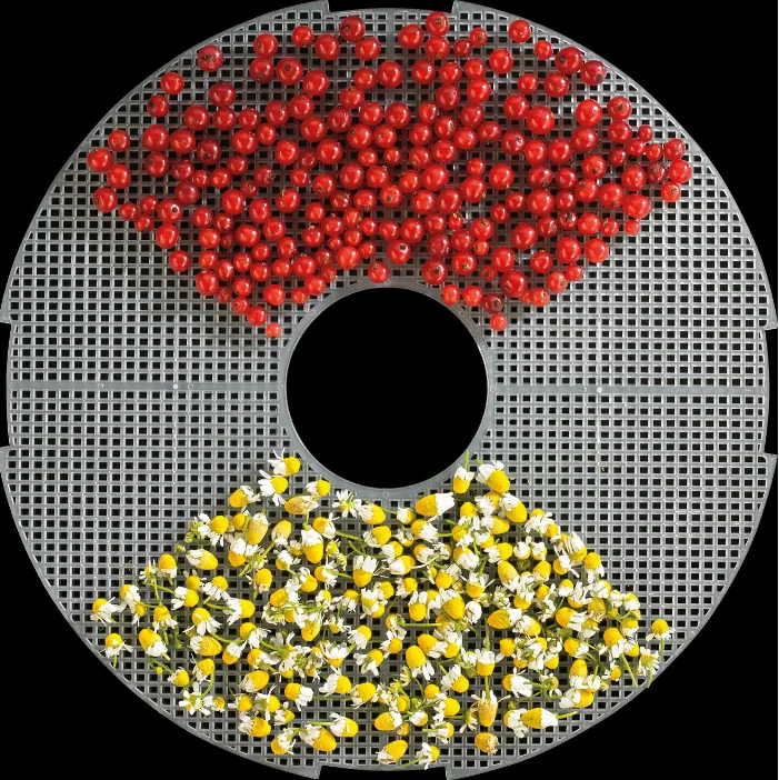5 лотков одновременноПять лотков легко устанавливаются друг на друга. Высоту каждого лотка можно настраивать в соответствии со своими потребностями. Так, можно одновременно сушить фрукты, мясо, овощи, цветы и травы. Лотки легко разбираются и очищаются.